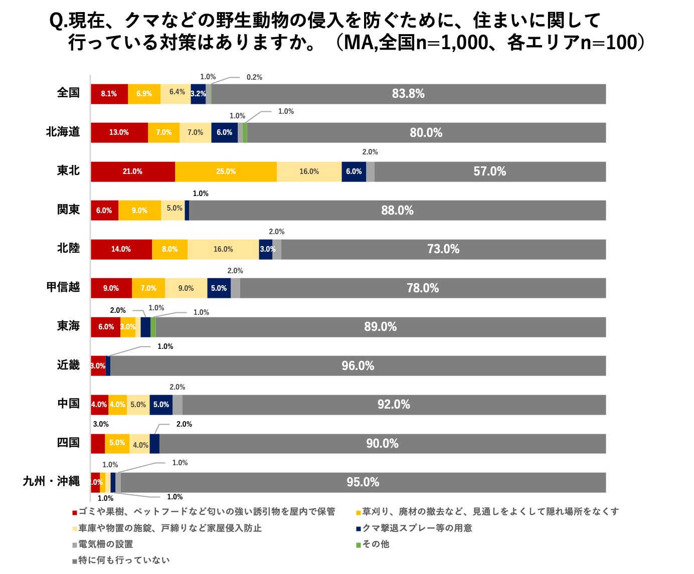 クマなどの野生動物の侵入を防ぐ住まいの対策については、全体で83.8%の方が「特に何も行っていない」と回答しており、具体的な行動に移せていない実態が浮き彫りとなりました。出没情報が多い東北エリアでは、「ゴミや果樹、ペットフードなどの管理(21.0%)」や「草刈り、廃材の撤去(25.0%)」といった一定の対策が見られるものの、57.0%の方が無対策の状態にあります。