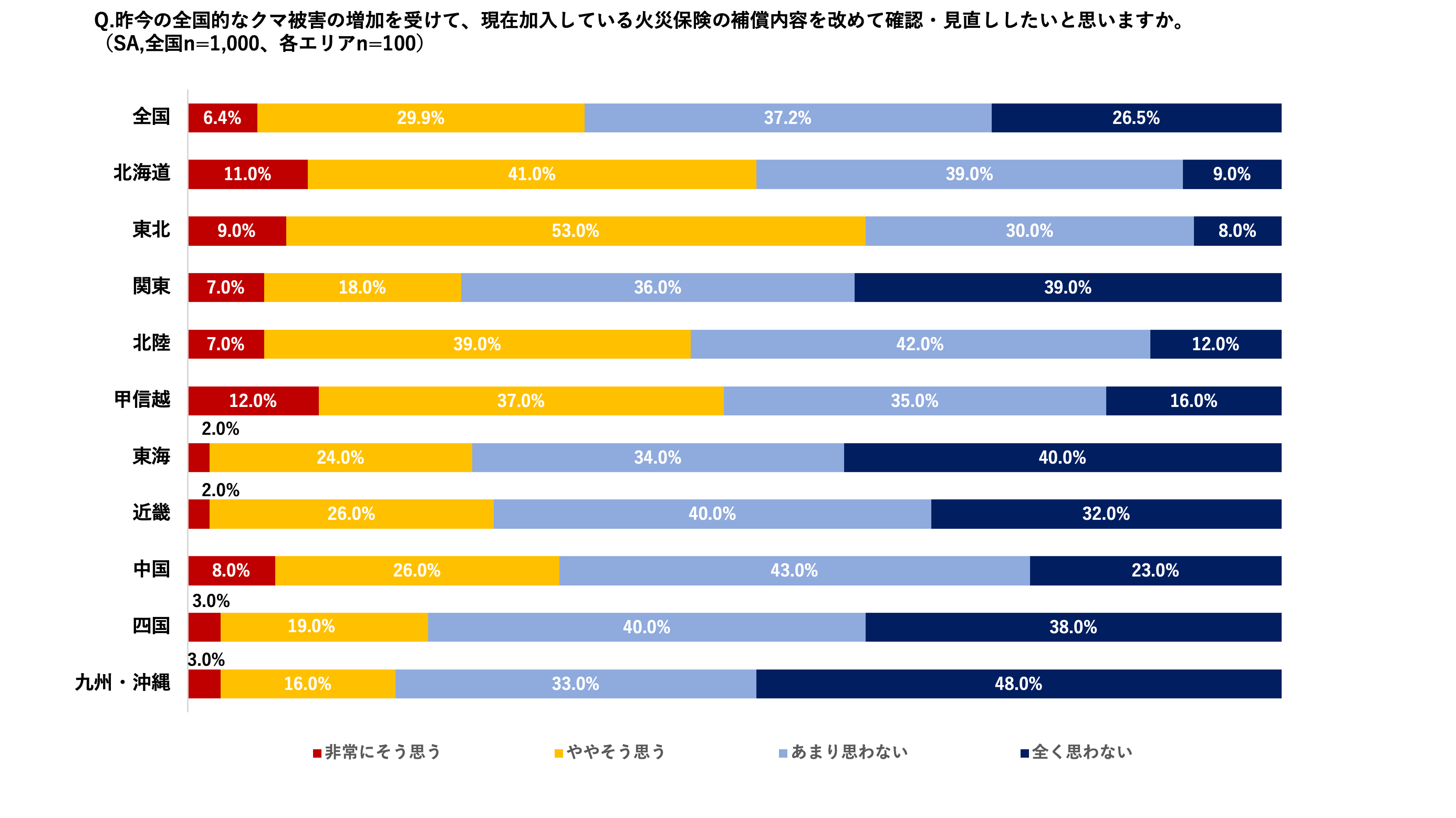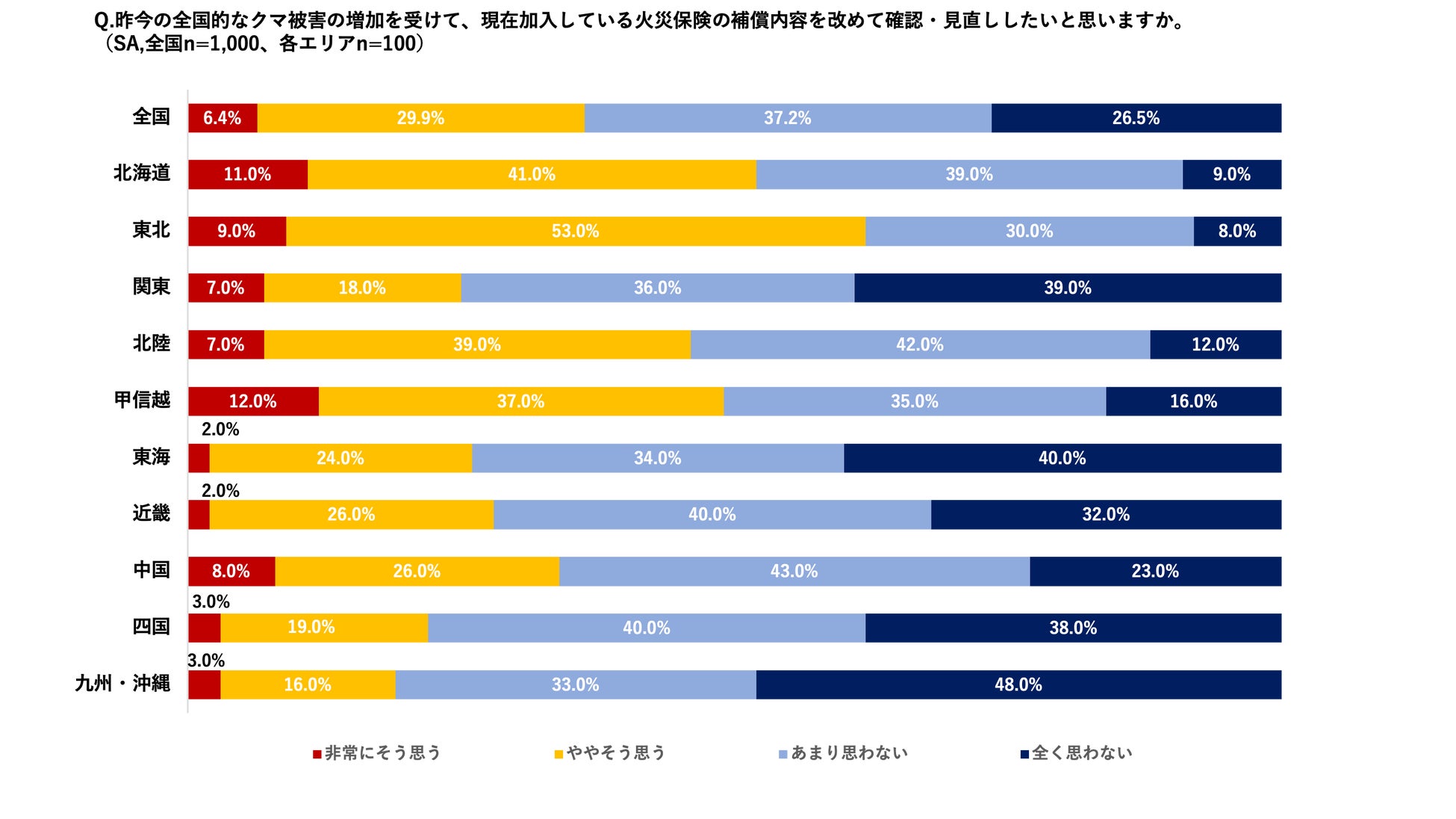 ・昨今の全国的なクマ被害の増加を受け、今後の火災保険の補償内容を確認・見直ししたいかの意向については、全体でみると「非常にそう思う(6.4%)」「ややそう思う(29.9%)」と36.3%に留まるものの、クマの出没数が多い地域では、東北で62.0%、北海道で52.0%、甲信越で49.0%が「確認・見直したい」と回答。