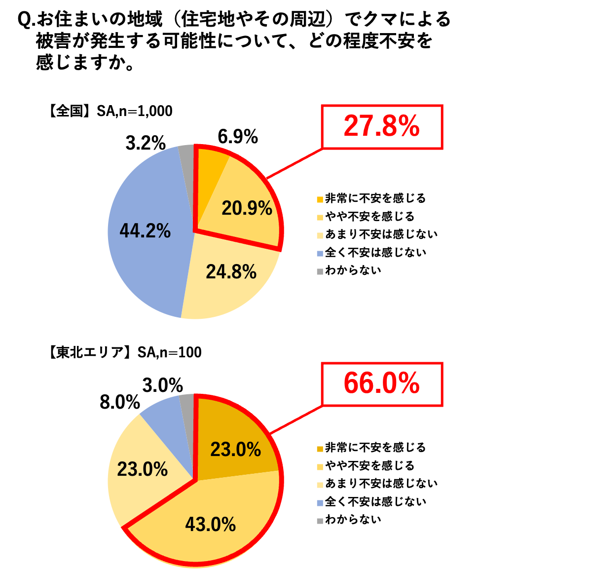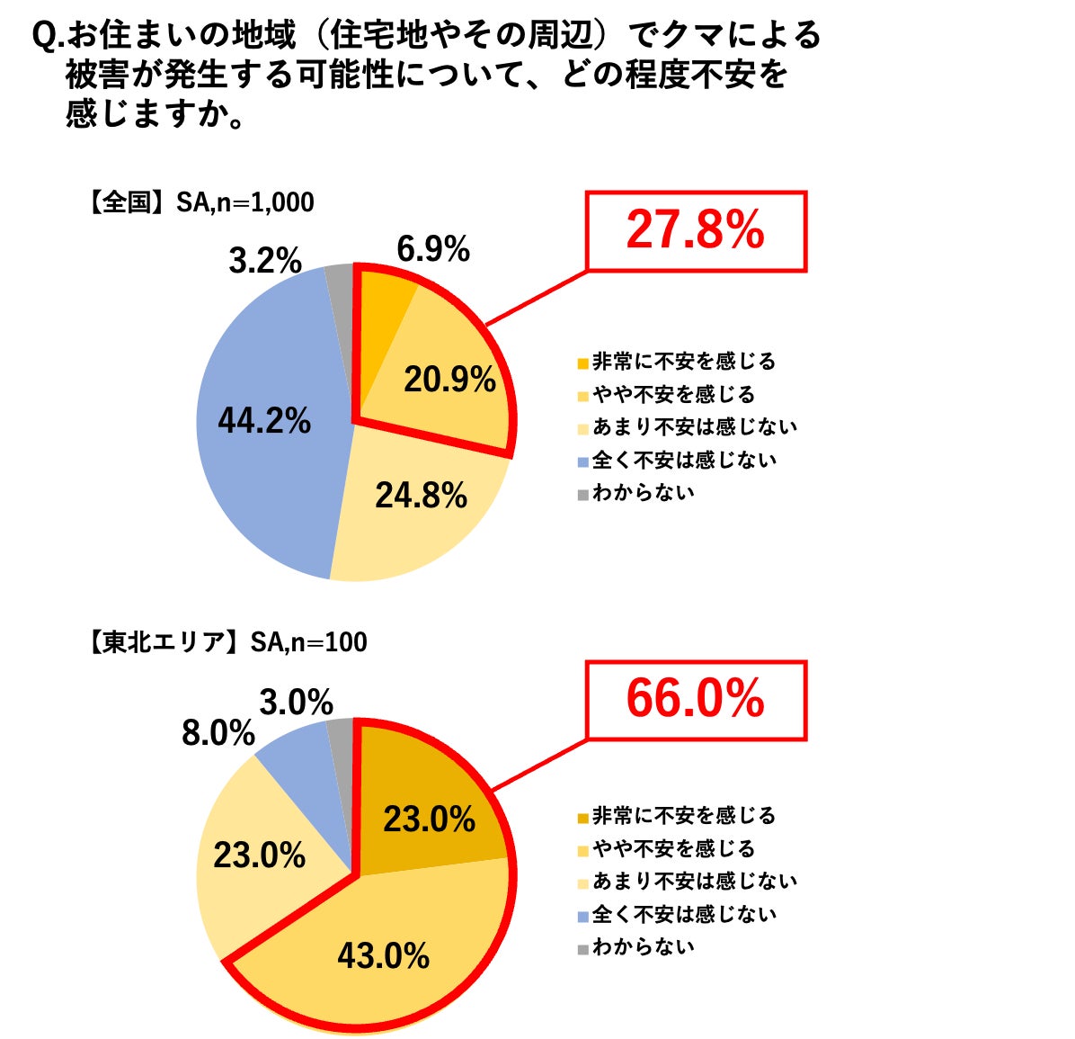 こうした出没頻度の高さは住民の心理にも大きな影響を与えており、自分が住む地域での被害発生について、全体の27.8%が不安を感じている中で、特に東北エリアでは66.0% (「非常に不安を感じる」23.0%、「やや不安を感じる」43.0%)もの人々が身近な脅威として危機感を募らせています。結果から、出没情報を耳にする頻度が高い地域ほど、不安も高まっていることがわかります。特に東北エリアでは出没情報の認知が86.0%(「頻繁に聞いた」38.0%、「時々聞いた」40.0%、「一度だけ聞いた」8.0%)と全エリア中で最も高く、そのまま不安の高さに直結している点が特徴的です。