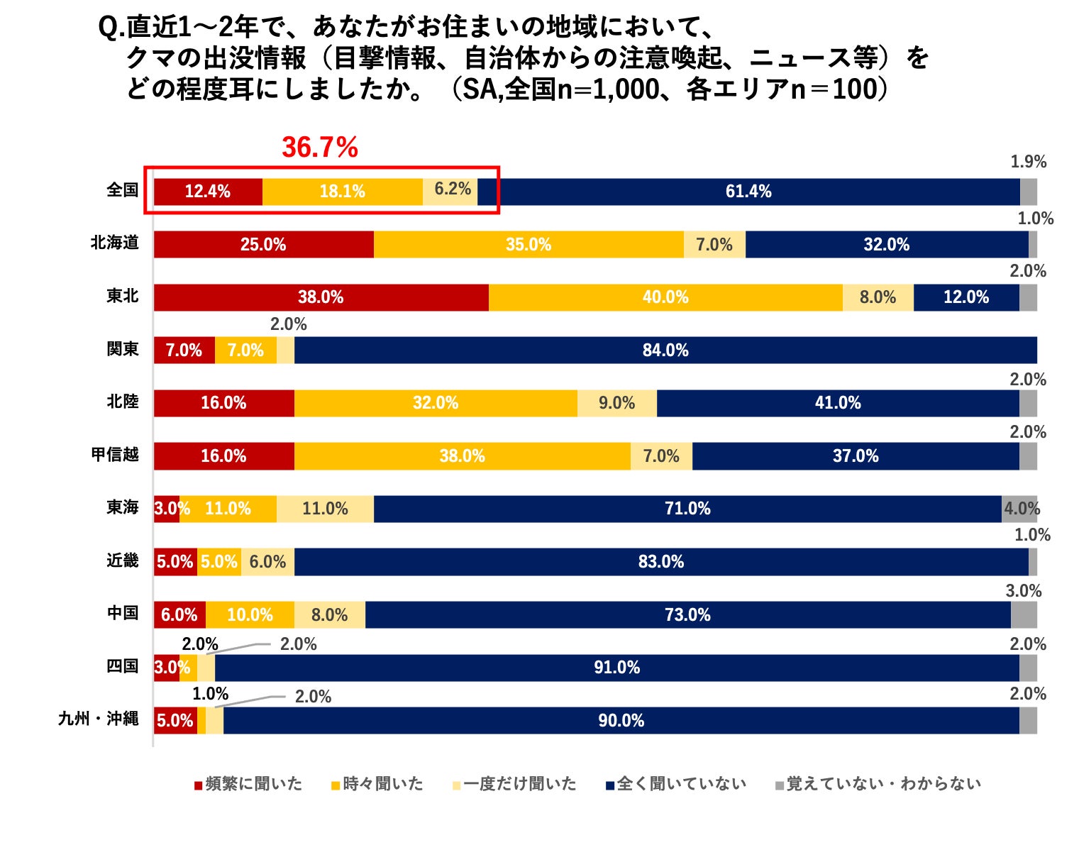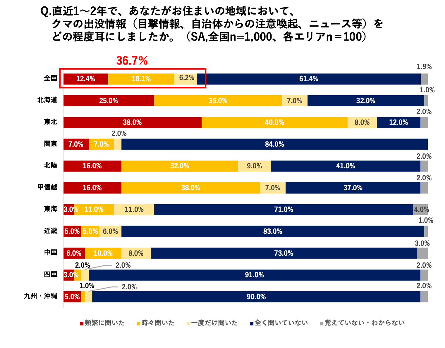 ・直近1〜2年以内に居住地域でクマの出没情報を耳にした人は、全体で3割超(36.7%)にのぼる。エリア別にみると、北海道・東北・北陸・甲信越の4エリアでは2人に1人以上が出没情報を耳にしており、地域的な偏りがうかがえる。