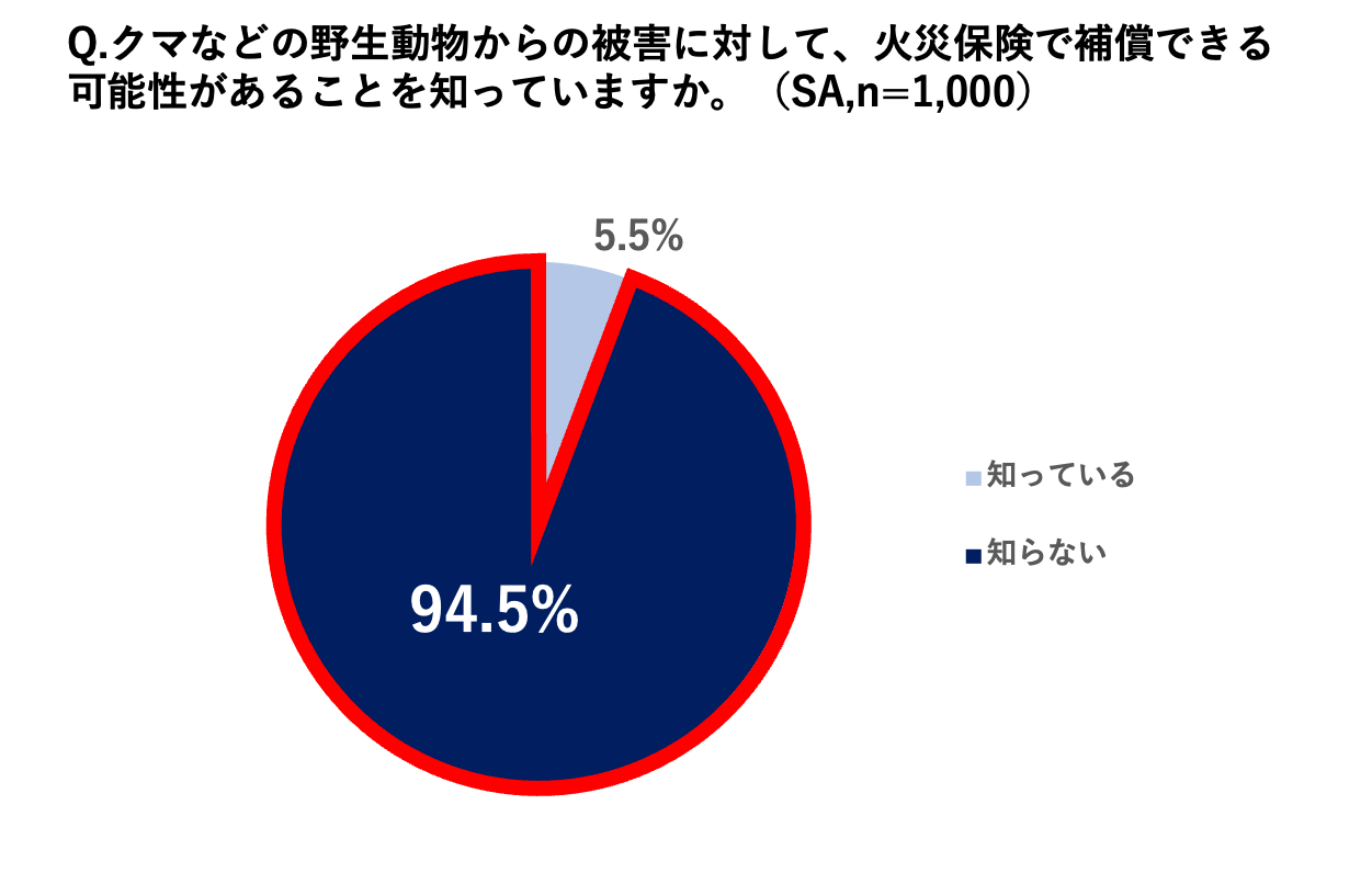 ・クマによる建物被害が火災保険で補償できる可能性があることについて、94.5%が「知らない」と回答。