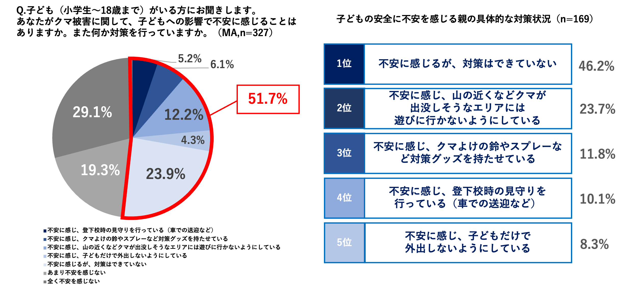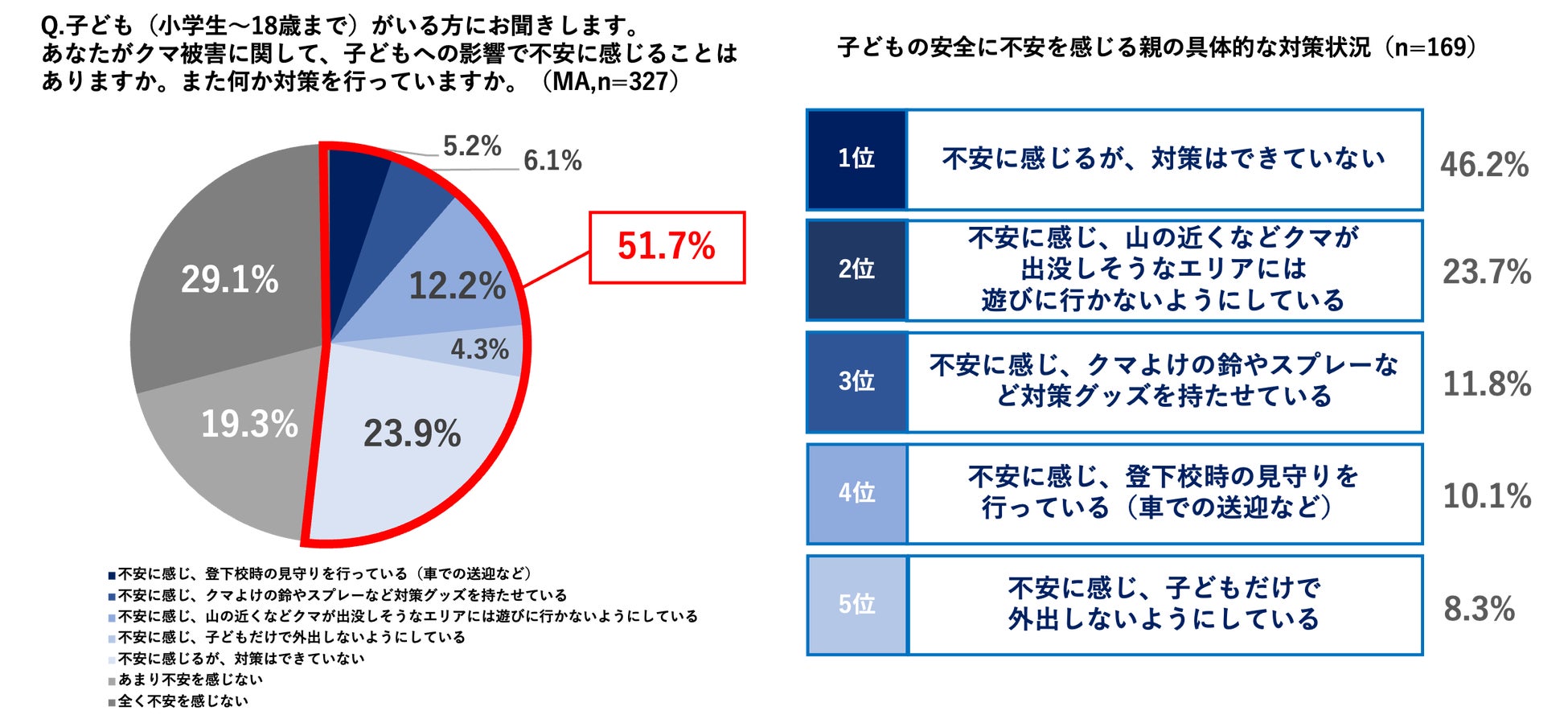 小中高生(小学生〜18歳)のお子さまがいる世帯(n=327)を対象に、クマ被害による子どもへの影響や不安について調査したところ、全体の半数以上(51.7%)が不安を感じていることが分かりました。そのうち、「不安を感じるが、対策はできていない」という回答は全体の23.9%にのぼり、不安を感じている層に限定すると、46.2%が「不安を感じつつも具体的な対策を実施できていない」実態が浮き彫りとなりました。