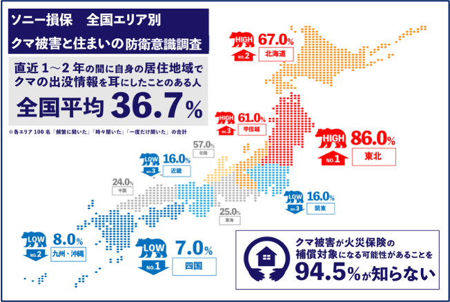 ソニー損害保険株式会社(代表取締役社長:坪田 博行、本社:東京都大田区、以下「ソニー損保」)は、全国10エリアの持ち家居住者かつ火災保険加入者1,000名を対象に「クマ被害と住まいの防衛意識調査」を実施しました。調査の結果、住まいや敷地内への被害懸念を抱える人が約2割いることが判明しました。またクマ被害が火災保険の補償対象になる可能性があることを、9割以上の人が「知らない」と回答する結果となりました。