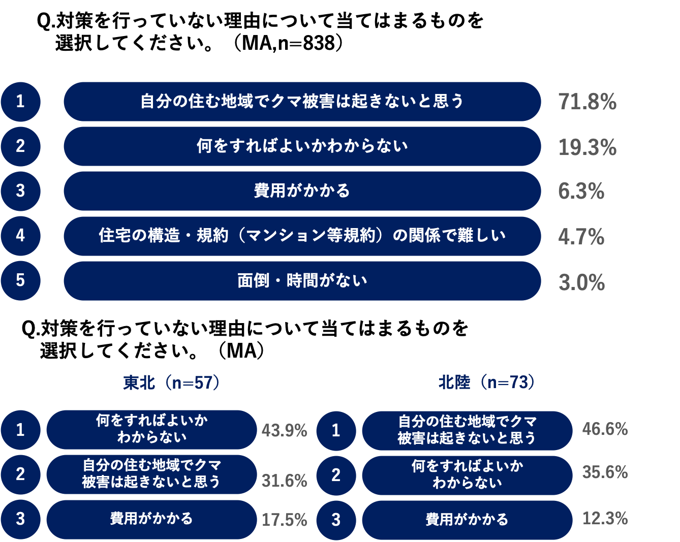 対策を行っていない理由として、全体では「自分の住む地域でクマ被害は起きないと思う(71.8%)」という回答が最多ですが、出没多発地域では、「何をすればよいかわからない」という声が、東北で43.9%、北陸で35.6%と多い結果となり、対策方法がわからないため「無対策」となっている状況もうかがえました。
