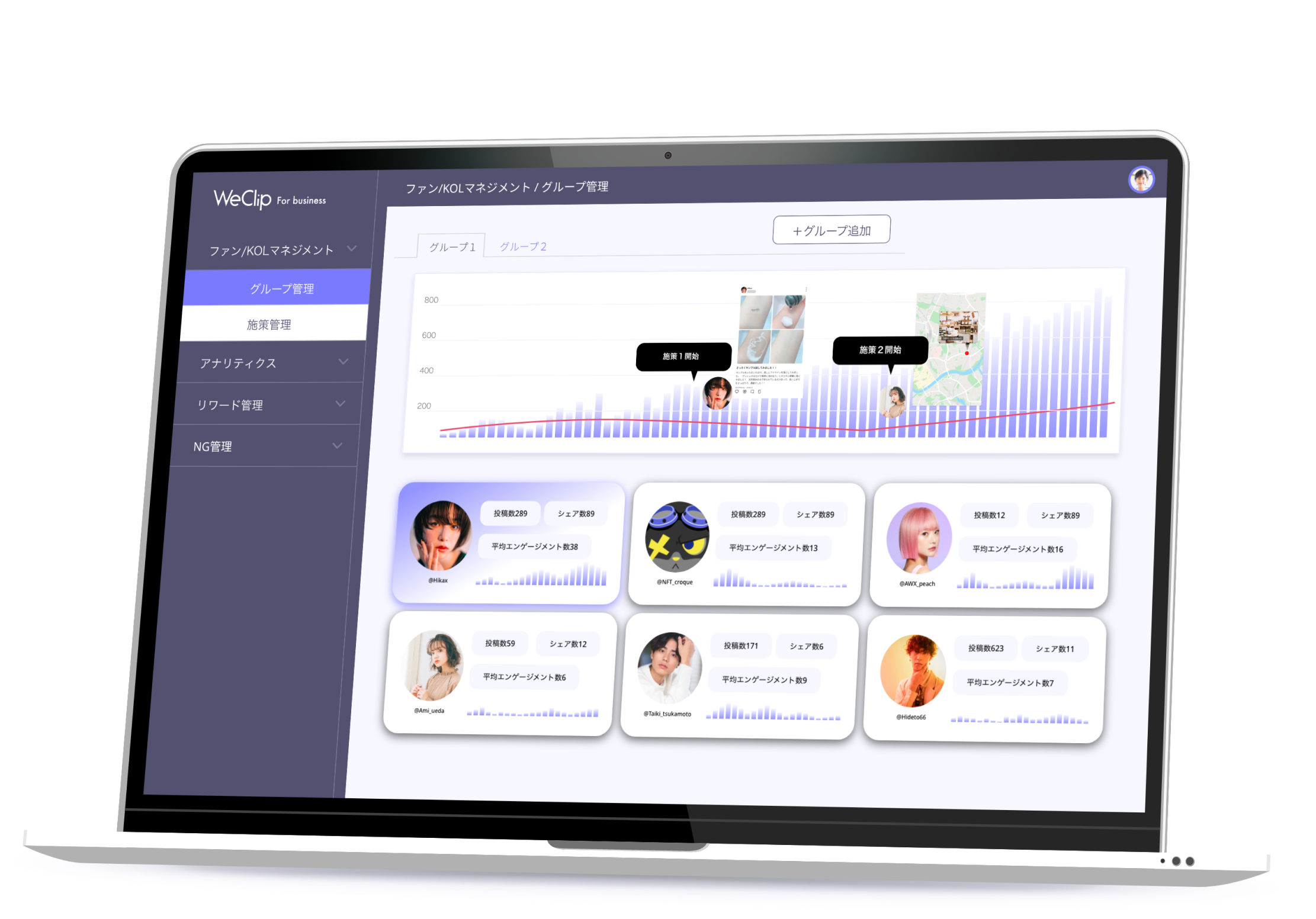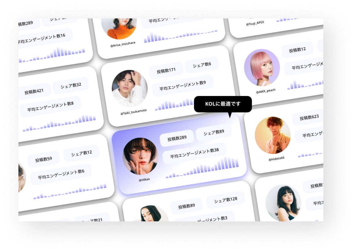 WeClipビジネス版では、独自の技術で参加者の投稿データや行動履歴を元に、KOL候補を可視化することで、適格な選定や効率的な育成が可能です。