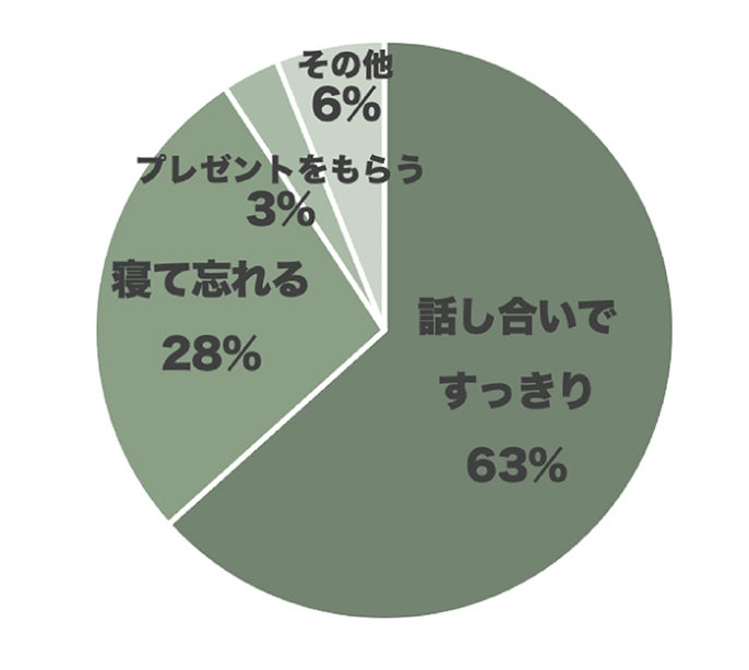 「どうやって喧嘩の仲直りをしたのか?」という質問に対し、「話し合いですっきり」という回答が約6割を占め、次いで多かったのは「寝て忘れる」という回答が約3割という結果になった。