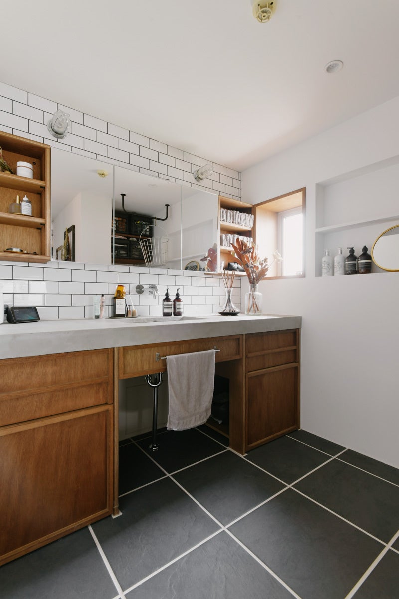 写真の事例は、洗面台の右下に猫用トイレを置くスペースを造りました。