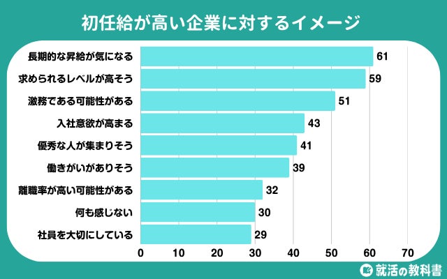最も多かったのは「長期的な昇給が気になる」(31%)で、「その先はどうなの?」という慎重な視点が強く表れています。次いで「求められるレベルが高そう」(30%)や「激務である可能性」(26%)という回答になりました。「給料が高い=大変そう」と考える学生も多く、初任給の高さで入社意欲が一概に上がるわけではないと考えられます。