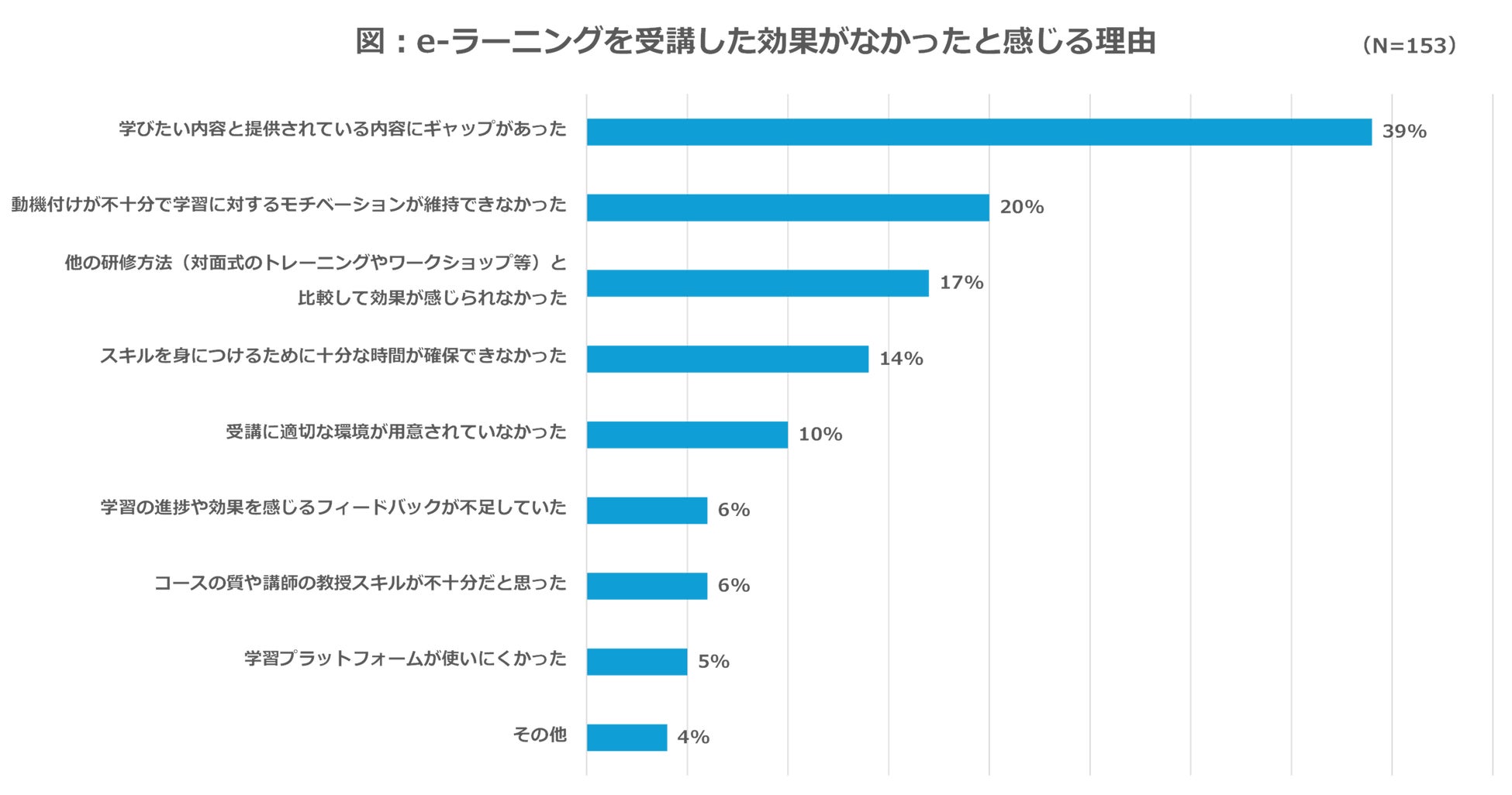 「実際にeラーニングを受講した効果がありましたか?」という質問に対し、「効果があった」と回答した企業人事は86%、受講側の従業員は59%という結果になり、企業人事と従業員の回答に約3割もの差があることが判明しました。更に、「e-ラーニングを受講し、効果がなかったと感じた理由はなんですか?」という質問に対して、40%の従業員が「学びたい内容と提供されている内容にギャップがあった」と回答しており、提供される学習コンテンツが画一的な内容で、実務に活用されにくいことが示唆されました。
