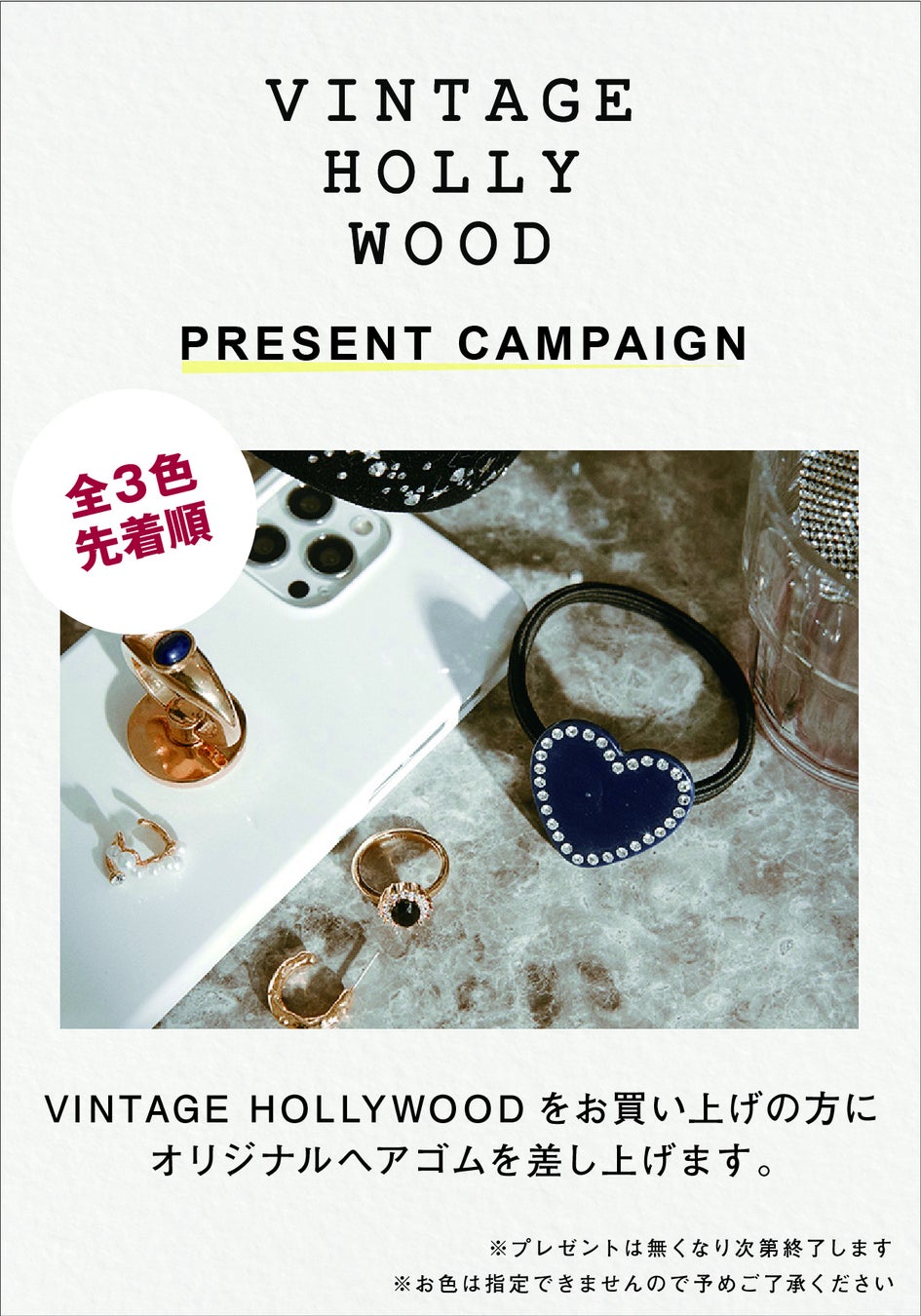 期間中に「VINTAGE HOLLYWOOD」ご購入のお客様にオリジナルヘアゴムをプレゼント。