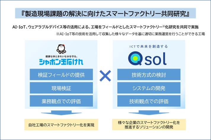 無添加石けんのパイオニアであるシャボン玉石けん株式会社(本社:福岡県北九州市/代表取締役社長 森田隼人)及びQsol株式会社(本社:福岡県福岡市、代表取締役社長:犬塚雅彦)は、シャボン玉石けんのスマートファクトリー※化に向け、AIやIoT、ウェアラブルデバイス等を活用した実証実験および共同研究を開始します。