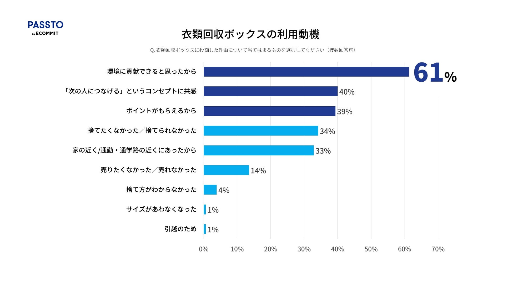 循環型社会に向けた不要品の回収・再流通のインフラを構築する株式会社ECOMMIT(本社: 鹿児島県薩摩川内市、代表取締役CEO:川野 輝之、以下「ECOMMIT」)は、当社が運営する資源循環サービス「PASSTO(パスト)」が展開するイオンモール佐賀大和店の衣類回収ボックス利用ユーザー(さすてなポイントの登録ユーザー)*¹に調査を行いました。(回答数155件)その結果、衣類回収ボックス利用ユーザーの73%が40〜60代の女性で、61%が「環境に貢献できること」を理由に利用し、43%が衣類回収ボックスの利用を目的として設置店舗へ来館していることがわかりました。また、衣類を手放す手段として、環境省が実施した調査に比べて廃棄する割合が少なく、 リユース(再販売、寄付、譲渡)や回収サービス利用の割合が多いことも明らかになりました。