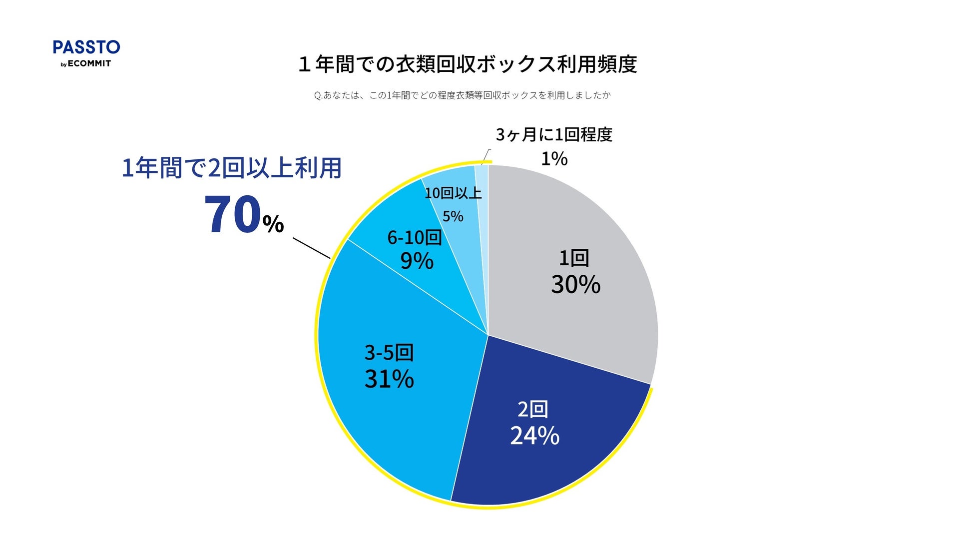 年間の衣類回収ボックスの利用頻度は2回以上が70%を占め、利用頻度の平均は3.3回/年で、約3ヶ月半に1回の頻度で定期的に活用していることが明らかとなりました。