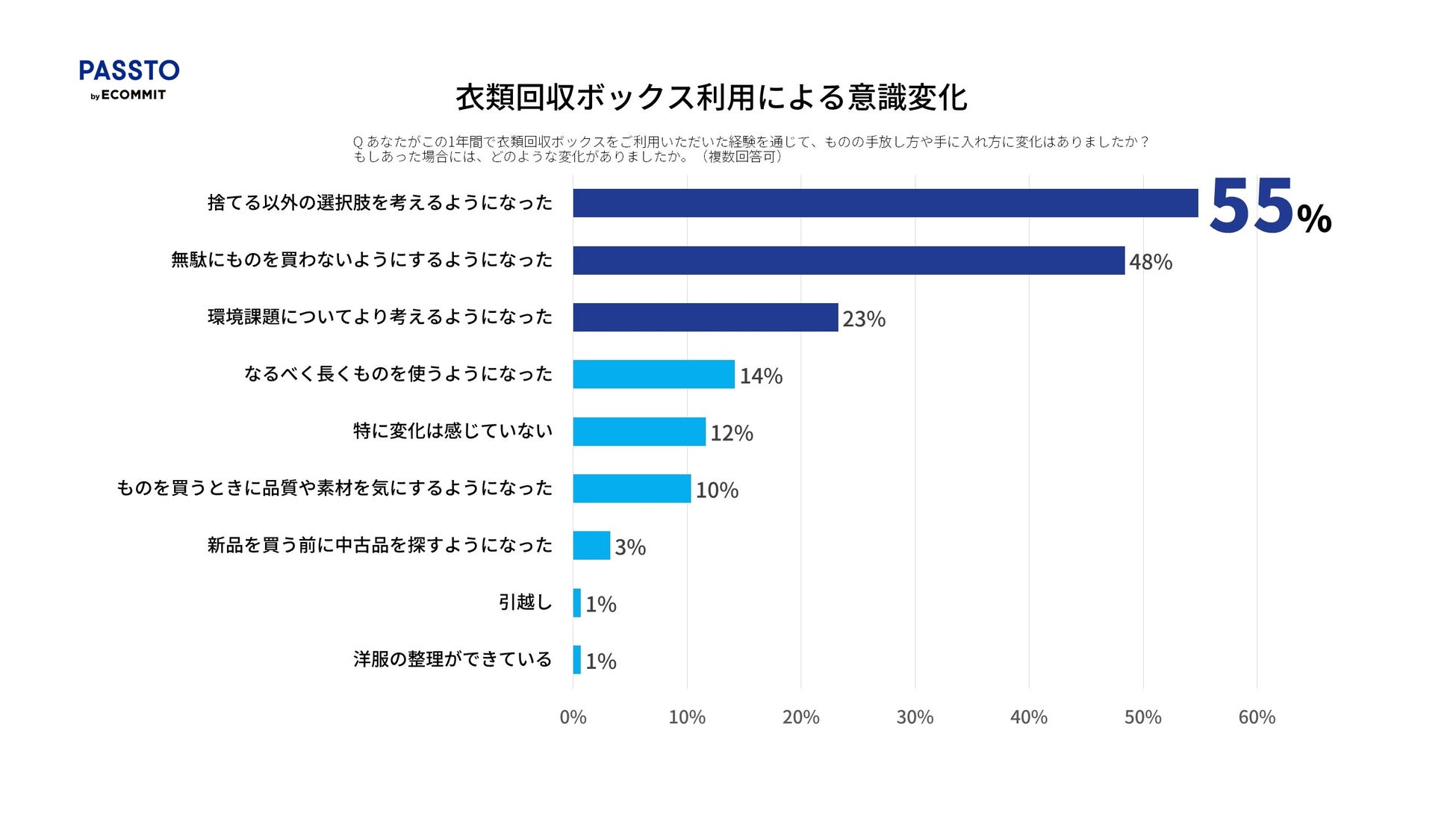 衣類回収ボックス利用後の意識変化として「捨てる以外の選択肢を考えるようになった」「無駄に買わないようにするようになった」というコメントが多くみられました。上記の回答結果のとおり、本来「購入する際は新品を買う」消費者層であっても、衣類回収サービスを利用する過程で、買い方やものとの付き合い方に意識の変化が生まれることがわかりました。