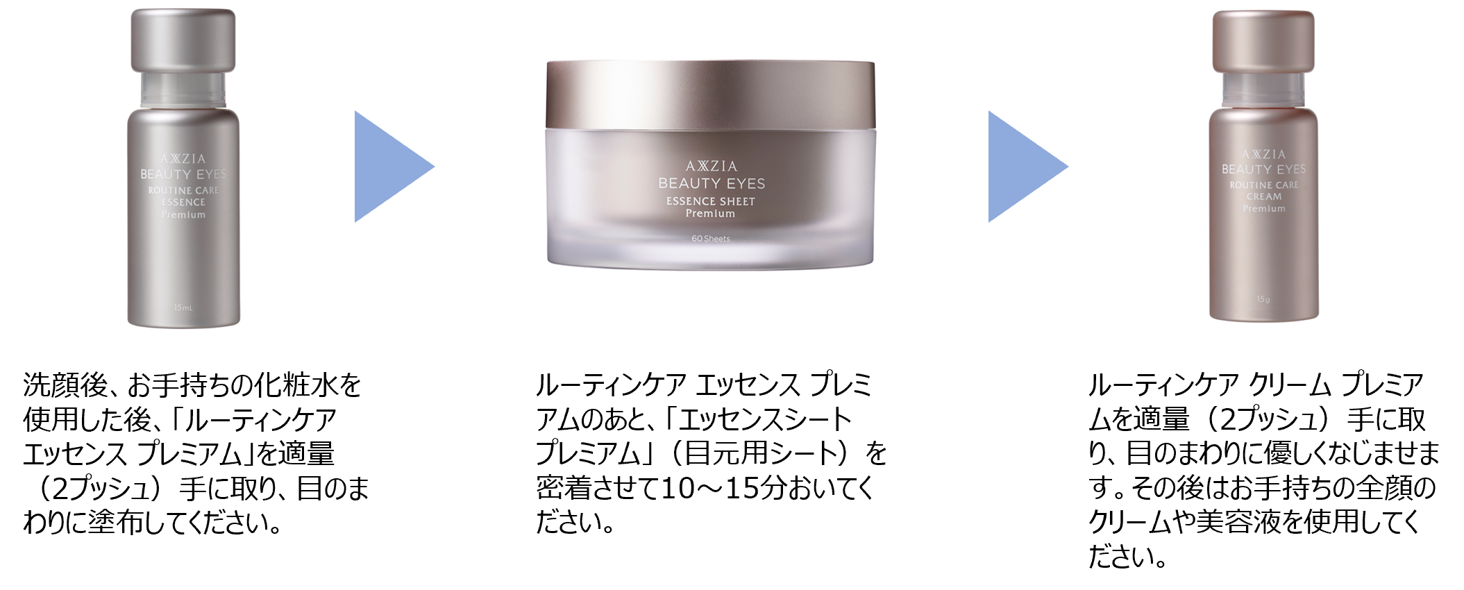 「アクシージア ビューティーアイズ」は、今回のプレミアムラインの完成により、今までより一歩上を行く*1サロンクオリティのプレミアムな目もとケアを提案します。