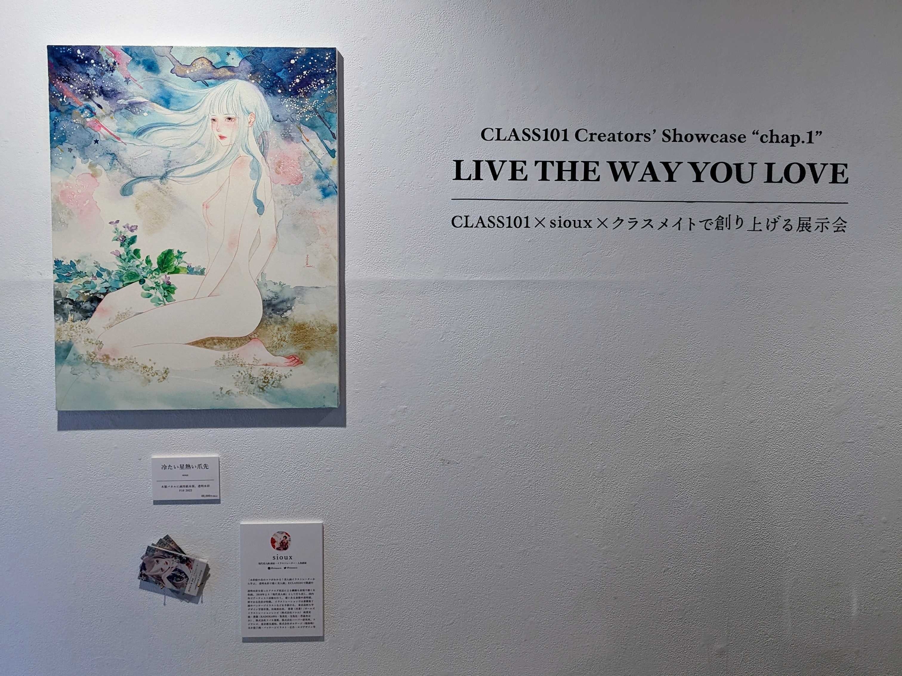 オンラインレッスン「CLASS101+(クラス ワンオーワンプラス)」を企画・開発・運営する、CLASS101JAPAN株式会社(本社:東京都新宿区、代表取締役:鄭然喜、以下「CLASS101」)は、CLASS101のビジョン「すべての人が好きなことをしていく世の中を創る」の実現を加速させるため、『CLASS101 Creators' Showcase “chap.1” LIVE THE WAY YOU LOVE 〜CLASS101×sioux×クラスメイトで創り上げる展示会〜』を、去る2022年12月6日(火)〜2022年12月11日(日)に開催しました。今後もCLASS101はビジョンのもと、「好き」を見つけ、学ぶ機会の提供、そして「好き」なことをして生きていく人々を応援する活動を推進して参ります。