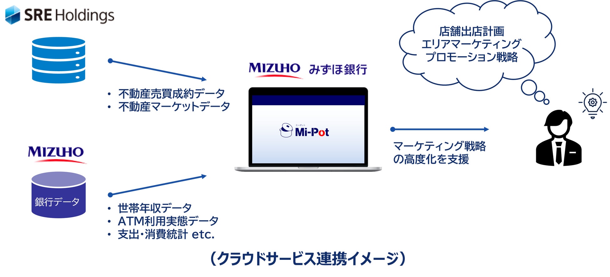 株式会社みずほ銀行(本社:東京都千代田区、頭取:加藤 勝彦、以下「みずほ銀行」)とSREホールディングス株式会社(本社:東京都港区、代表取締役 社長 兼 CEO:西山 和良、以下「SREHD」)は、クラウドサービスの連携を開始し、第一弾として、SREHDの不動産価格推定エンジン(以下、「本エンジン」)を、みずほ銀行が提供するMizuho Insight Portal (以下、「Mi-Pot」)に搭載しました。