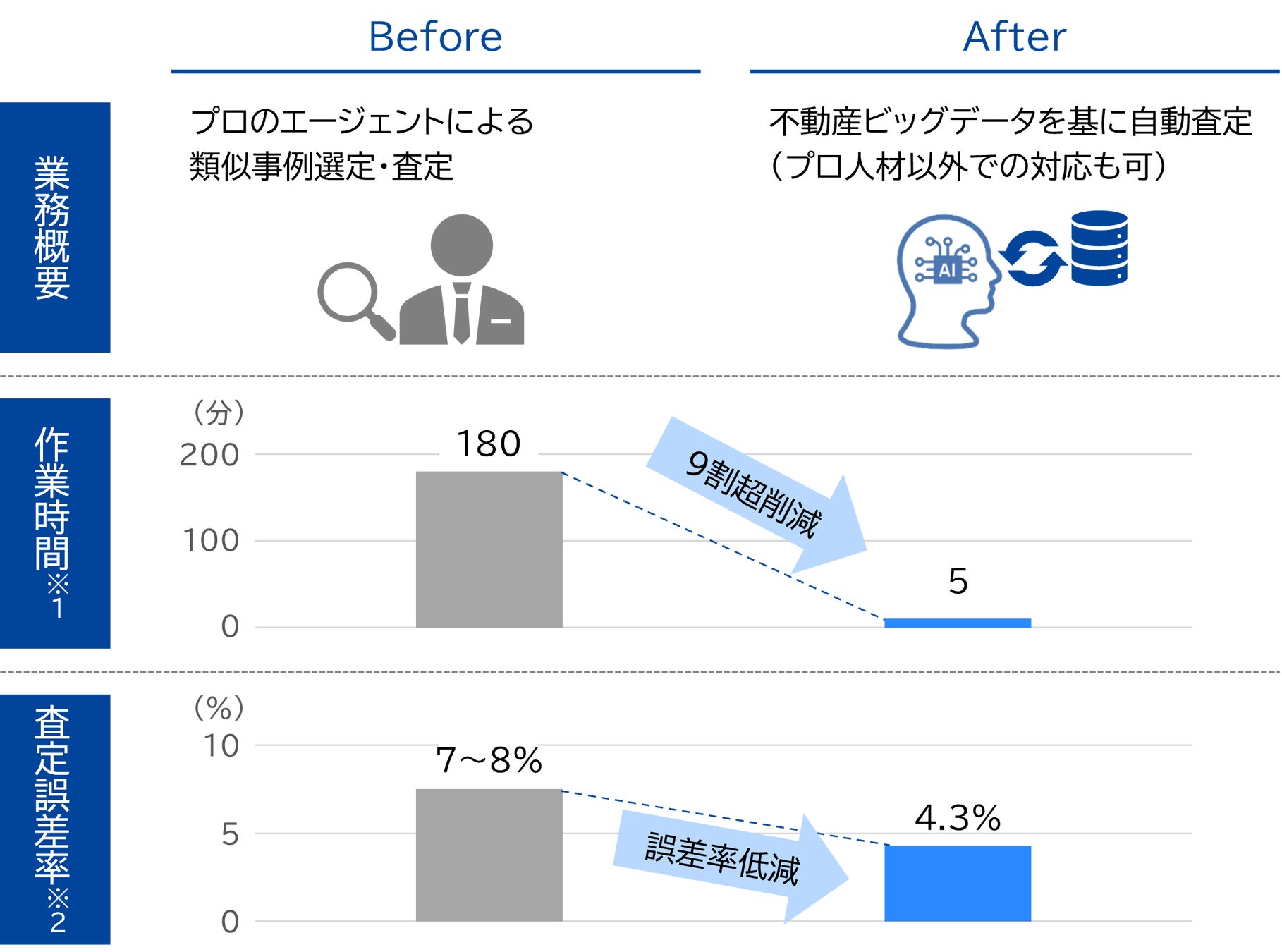 ※2 査定誤差率は、東京都23区内マンションに関する、SREHDエージェントによる査定結果又はAI不動産査定ツールによる査定結果と実際の取引価格の乖離率の中央値(2022年3月時点)