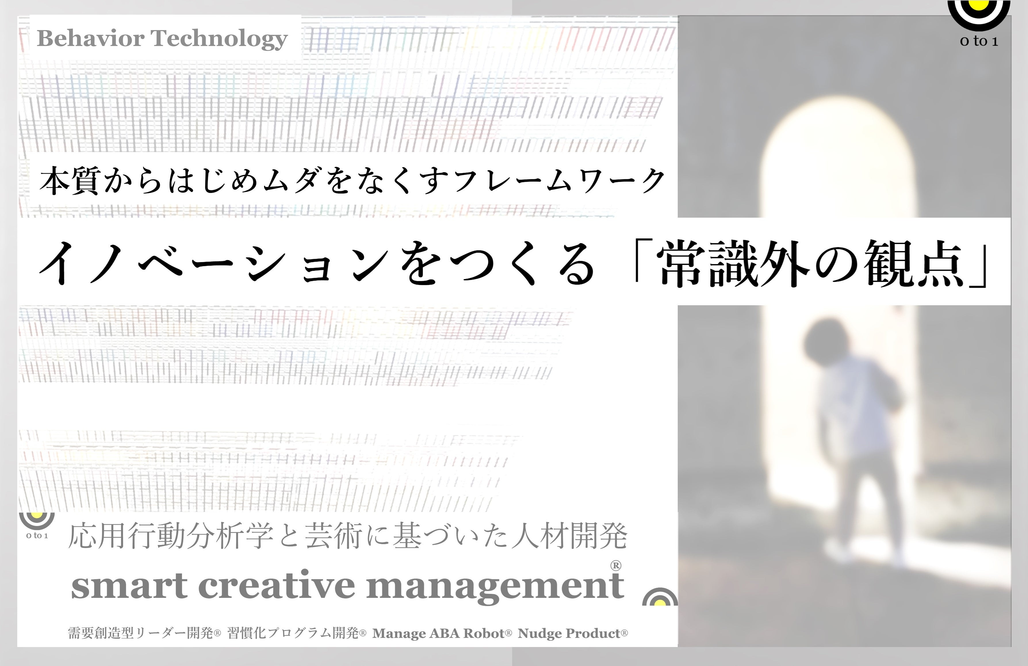事業戦略を実現する人材の「できることを自発的に増やす」行動変容プログラムを「事業個別の行動と思考の習慣・人間関係・感情など現場のパフォーマンスに影響を与えるウェットな実情」を踏まえ、綺麗事を排し、個別に研究・開発・制作する ABAオペレーションズ研究センター とスマートクリエイティブマネジメント総合研究所 を構え、応用行動分析学(ABA)と芸術(Art)に基づいた 人材開発技術 smart creative management® を開発。 840社以上、社員30,000人のグローバル企業から年商3億円の地域密着型企業への提供実績を有しています。