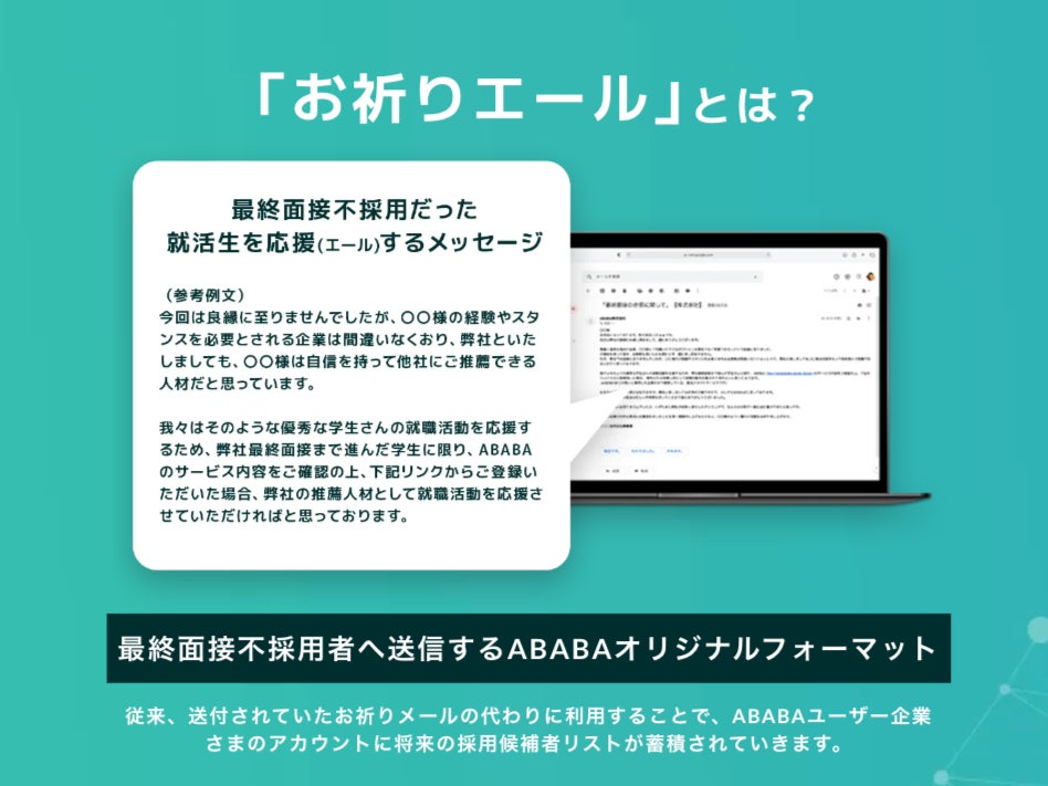 ABABAは企業が就活生に送信する不採用通知=「お祈りメール」を『エール』に変えて送るシステムを作ることで企業のブランドイメージの保持・向上にも貢献しています。