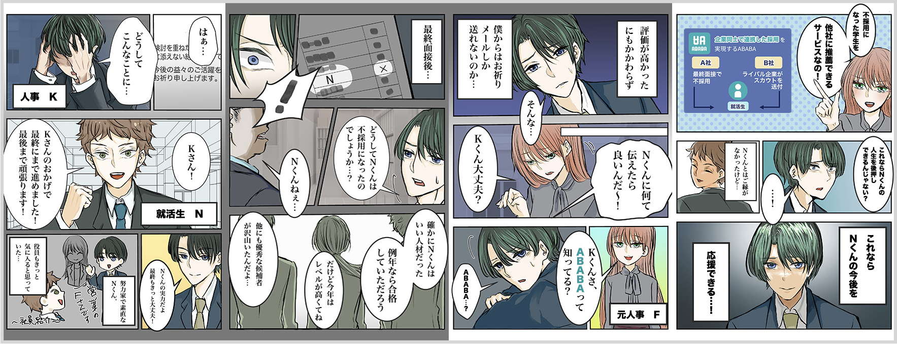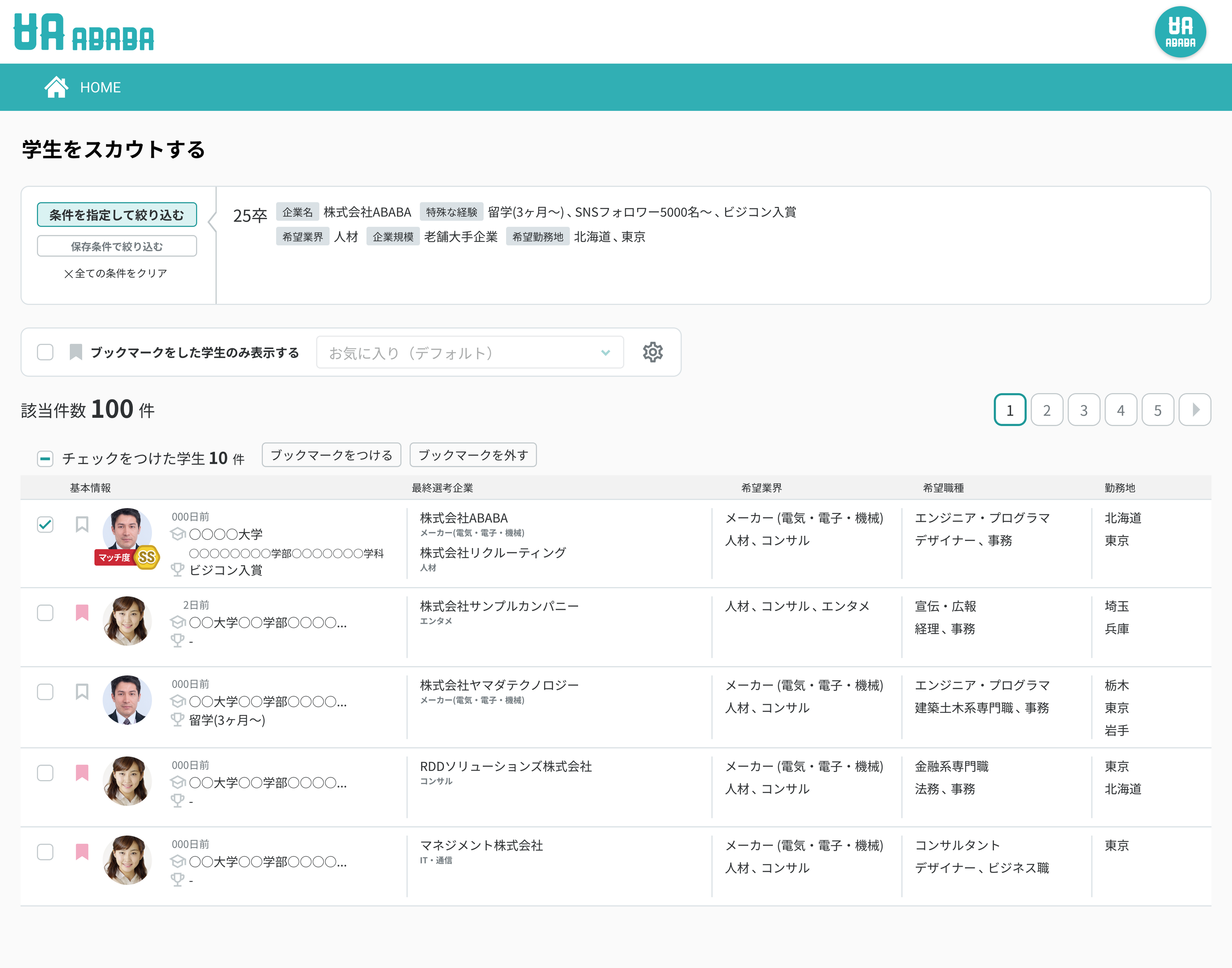「ABABA」は他社の最終面接まで進んだものの、残念ながら不合格となってしまった優秀な学生に対してスカウトが打てる新卒のダイレクトリクルーティングサービスです。
