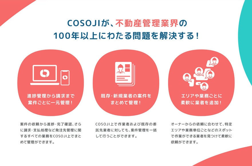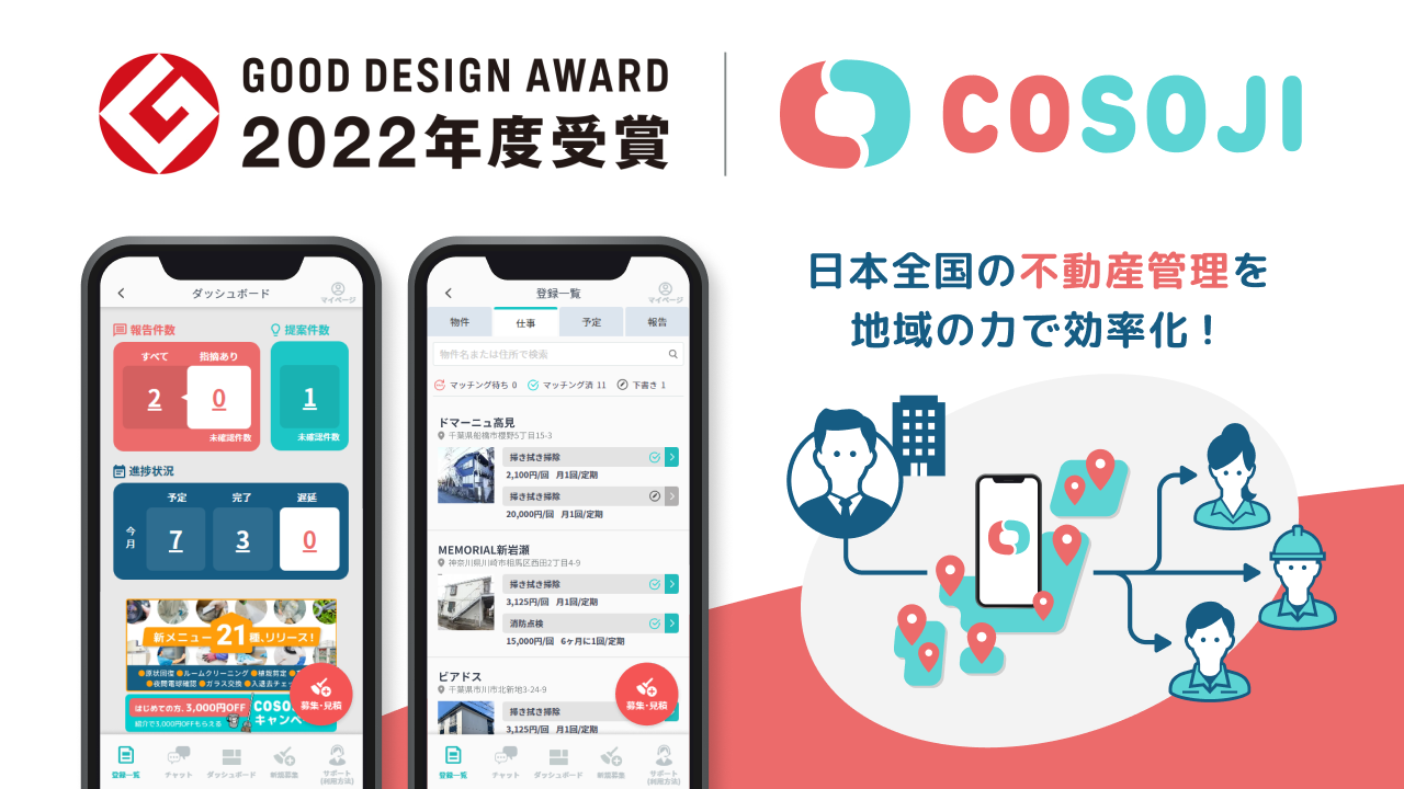 Rsmile株式会社(本社:東京都千代田区、代表取締役:富治林 希宇)が運営する「COSOJI(こそーじ)」は、このたび2022年度グッドデザイン賞(主催:公益財団法人日本デザイン振興会)を受賞いたしました。「COSOJI」は、不動産管理業務における作業員の方々への受発注から工程管理まで、ワンストップで行えるサービスです。