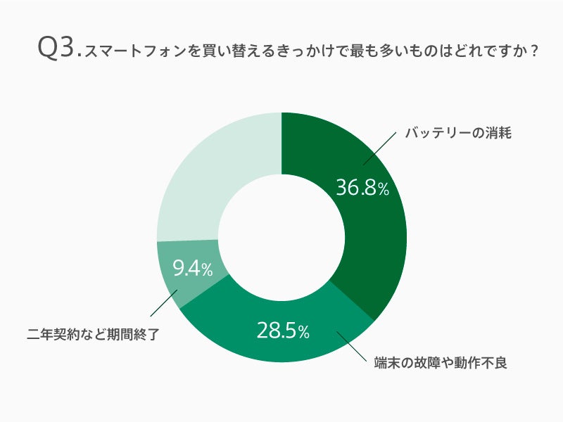 また、買い替えのきっかけについても調査。「バッテリーの消耗(36.8%)」、「端末の故障や動作不良(28.5%)」など、機能の不満に関する理由で買い替えを決断する人が多い結果となりました。
