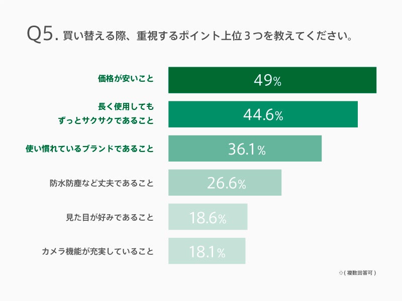 - 買い替え時に重視するポイントTOP3は「価格」「長く続くサクサク感」「ブランド」