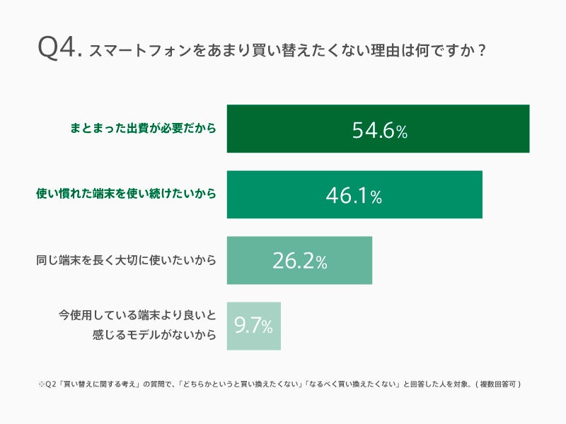 「買い替えに関する考え」の質問で、「どちらかというと買い換えたくない」「なるべく買い換えたくない」と、買い替えに慎重な回答した人を対象に、その理由を尋ねると「まとまった出費が必要だから(54.6%)」が1位に。次に、「使い慣れた端末を使い続けたいから(46.1%)」がランクインしました。