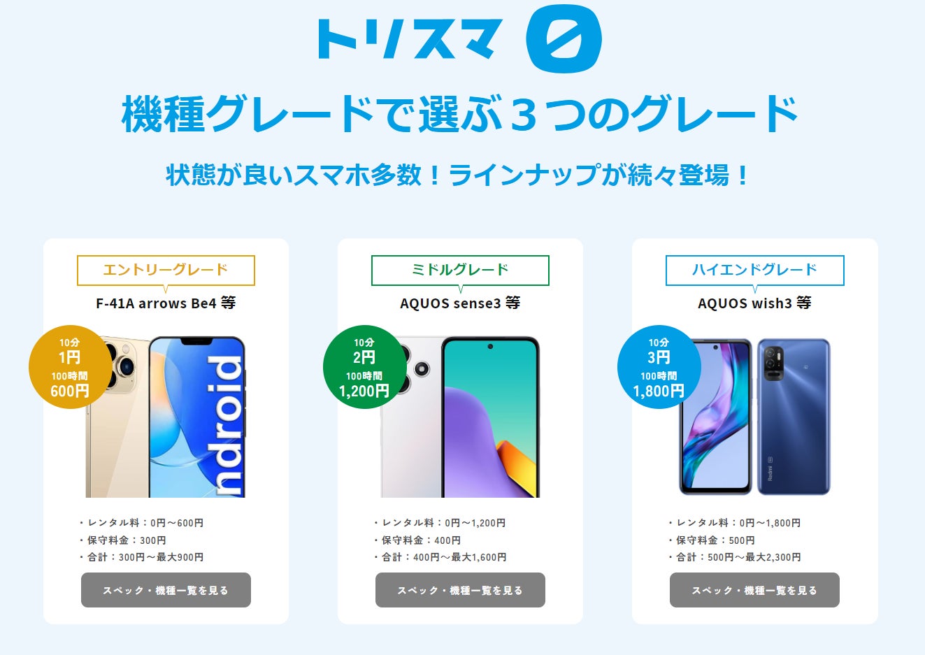 1時間6円から。10分単位で課金されるスマホ本体のレンタル「トリスマ0」