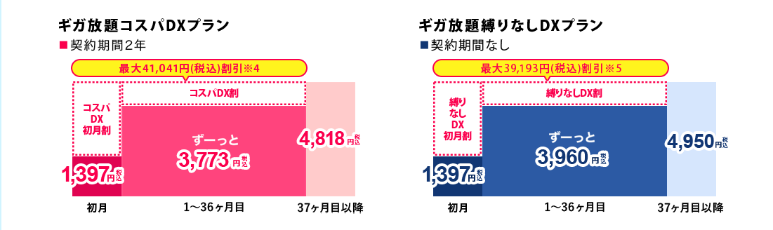 ※4 ギガ放題コスパDXプランは基本料金4,818円(税込)より、「コスパDX初月割」にて初月は最大3,421円(税込)割引、「コスパDX割」にて1-36ヶ月目は1,045円(税込)割引され、最大41,041円(税込)が割引となります。