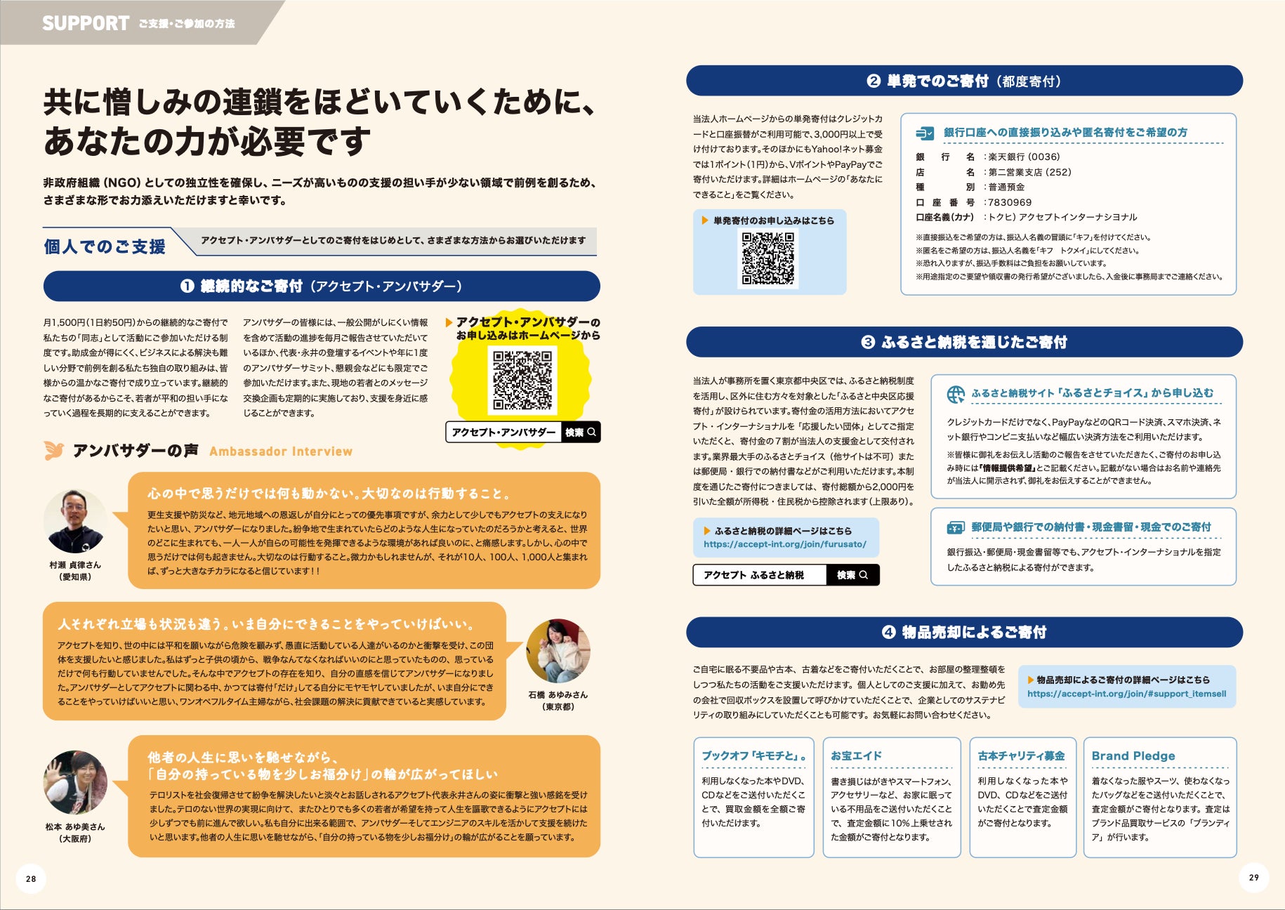 個人・法人としてのご支援方法についても4ページにわたって幅広く掲載しています。寄付はもちろん、物品売却や電力切り替えを通じたご寄付などもございます。