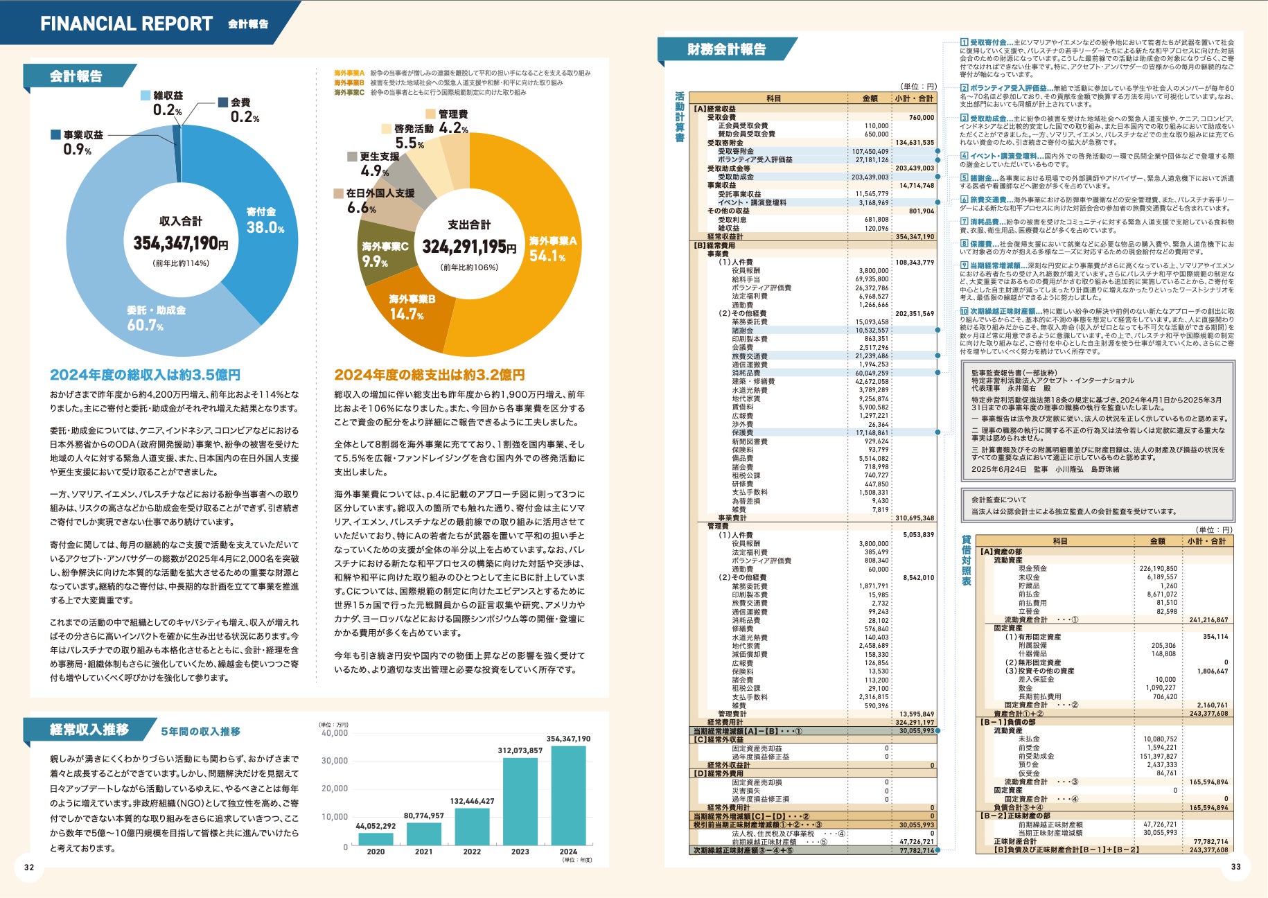 活動報告書には、代表理事からのメッセージ、2024年度のハイライト、活動アプローチ、各事業の活動内容や成果、ご支援・ご参加の方法、会計報告などを掲載しています。