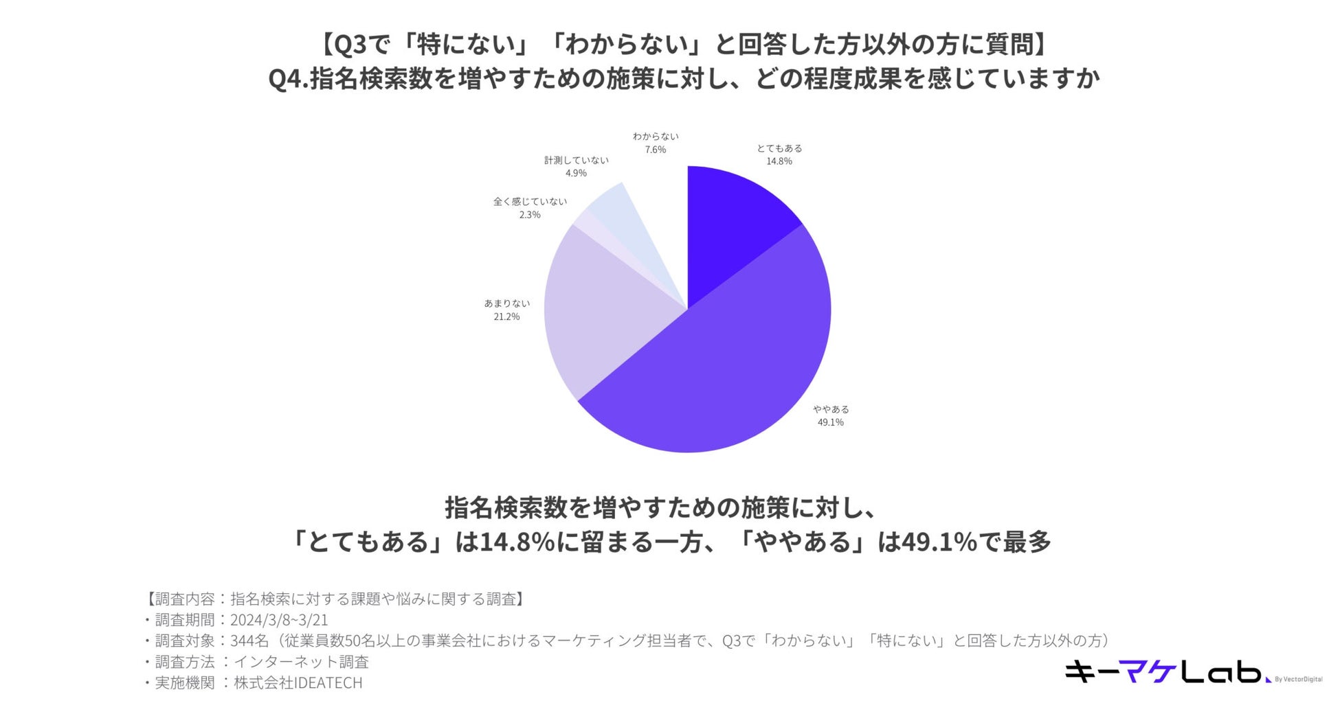 また、指名検索数増加のための施策に取り組んでいる344名に対して、どの程度施策の成果を感じているか聞いたところ、14.8%が「とてもある」、最多の49.1%が「ややある」と回答する結果となりました。