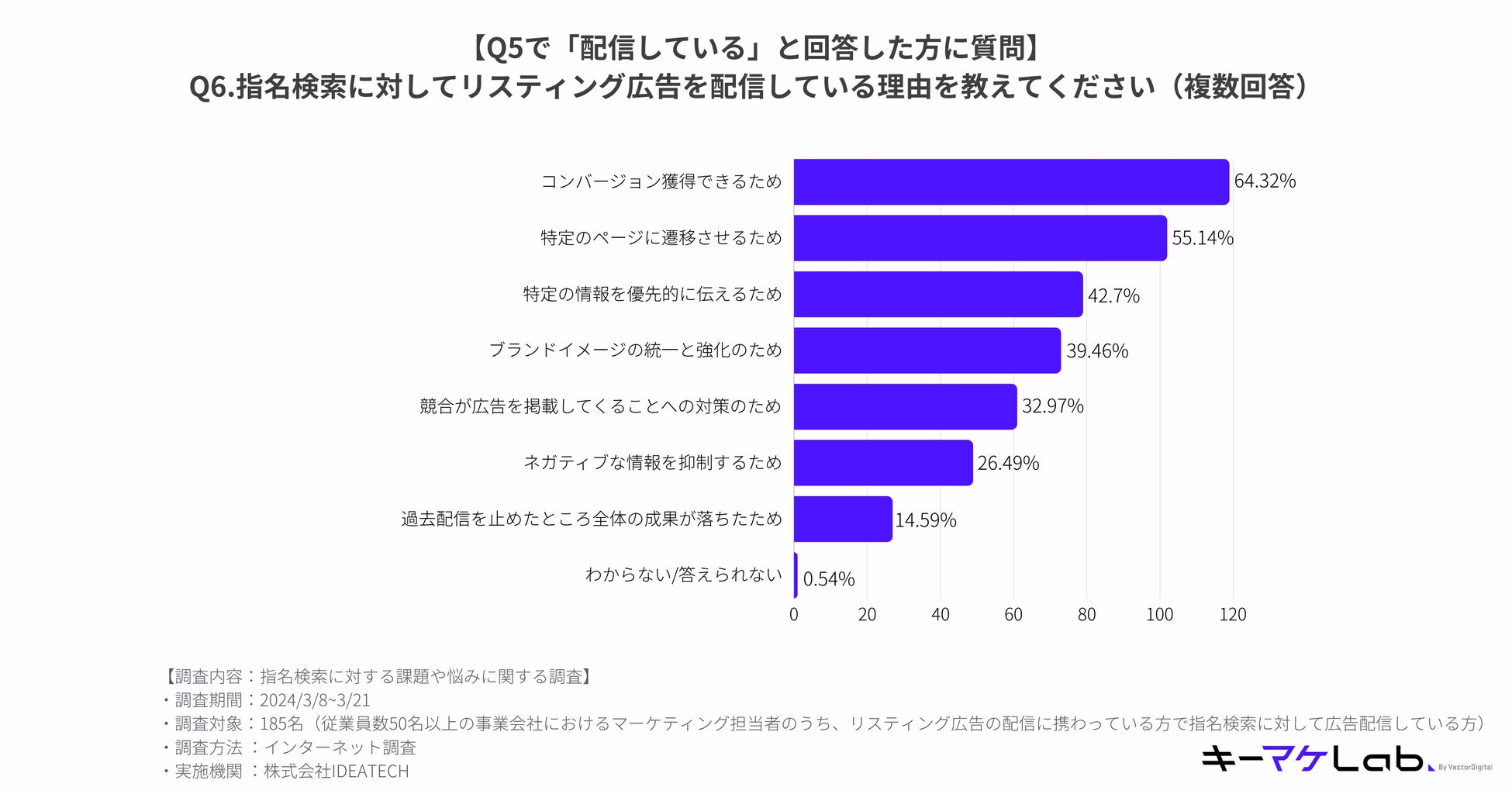その理由は、64.32%が「コンバージョン獲得できるため」、55.14%が「特定のページに遷移させるため」、42.7%が「特定の情報を優先的に伝えるため」と回答し、半数以上がコンバージョン獲得に重きをおいて指名検索に対してリスティング広告を配信していることがわかりました。