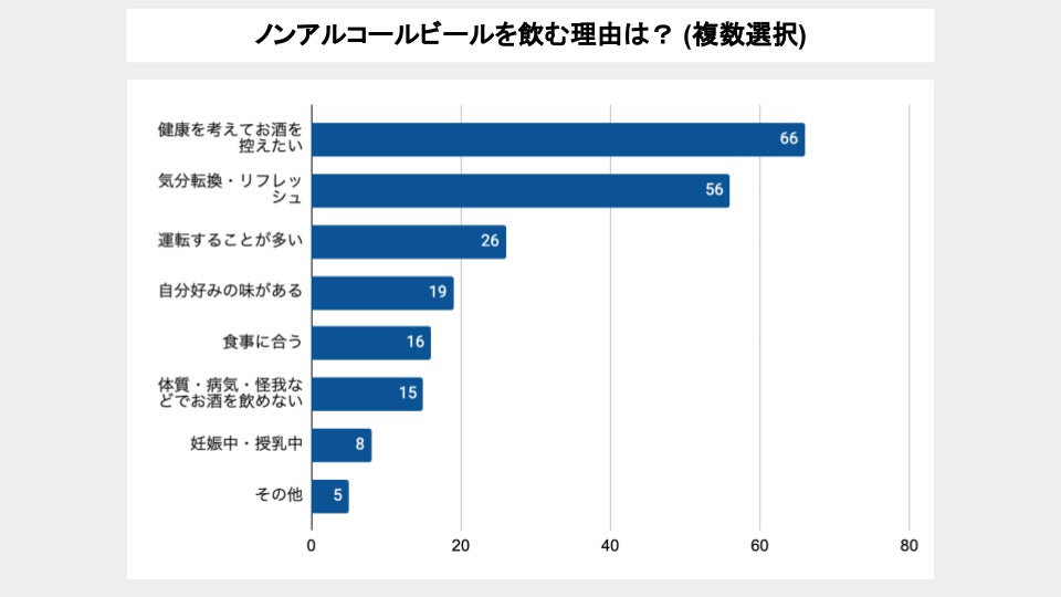 ノンアルコールビールを飲む理由では「健康を考えてお酒を控えたい」という人が最も多くなりました。