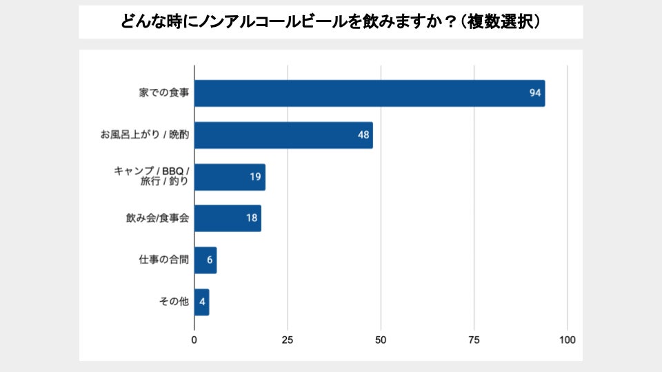 「ノンアルコールビールを飲む場面」を調査したところ、「家での食事」「お風呂あがり / 晩酌」に回答が多く集まりました。