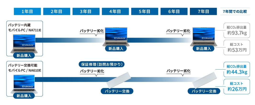 『Endeavor NA610E』シリーズは、ツールフリーで簡単にバッテリー交換が可能なモデルです。快適なパフォーマンスを長期にわたり維持できるだけでなく、PCを長期間使用することにより買い替えの総コストが大幅に削減され、PCの調達・導入時の工数も削減できます。また製造の際に発生するCO2排出量の削減にもつながります。