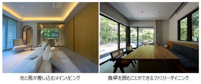 建物は、自然と調和するアースカラーでまとめられた平屋。内庭をコの字型に囲う形で建物を配置し、住まいのどこからでも家族の気配を感じることができる構成になっています。建物の中心に位置するメインリビングは、内庭に面した大きな窓から光と風が差し込む気持ちの良い空間に。ファミリーダイニングには、家族団らんの場として囲炉裏や炬燵のように食卓を囲むことができるテーブルとベンチ式のソファをデザインし、団らんの時間を通じて家族の絆を深め、憩える場を実現しています。