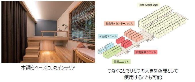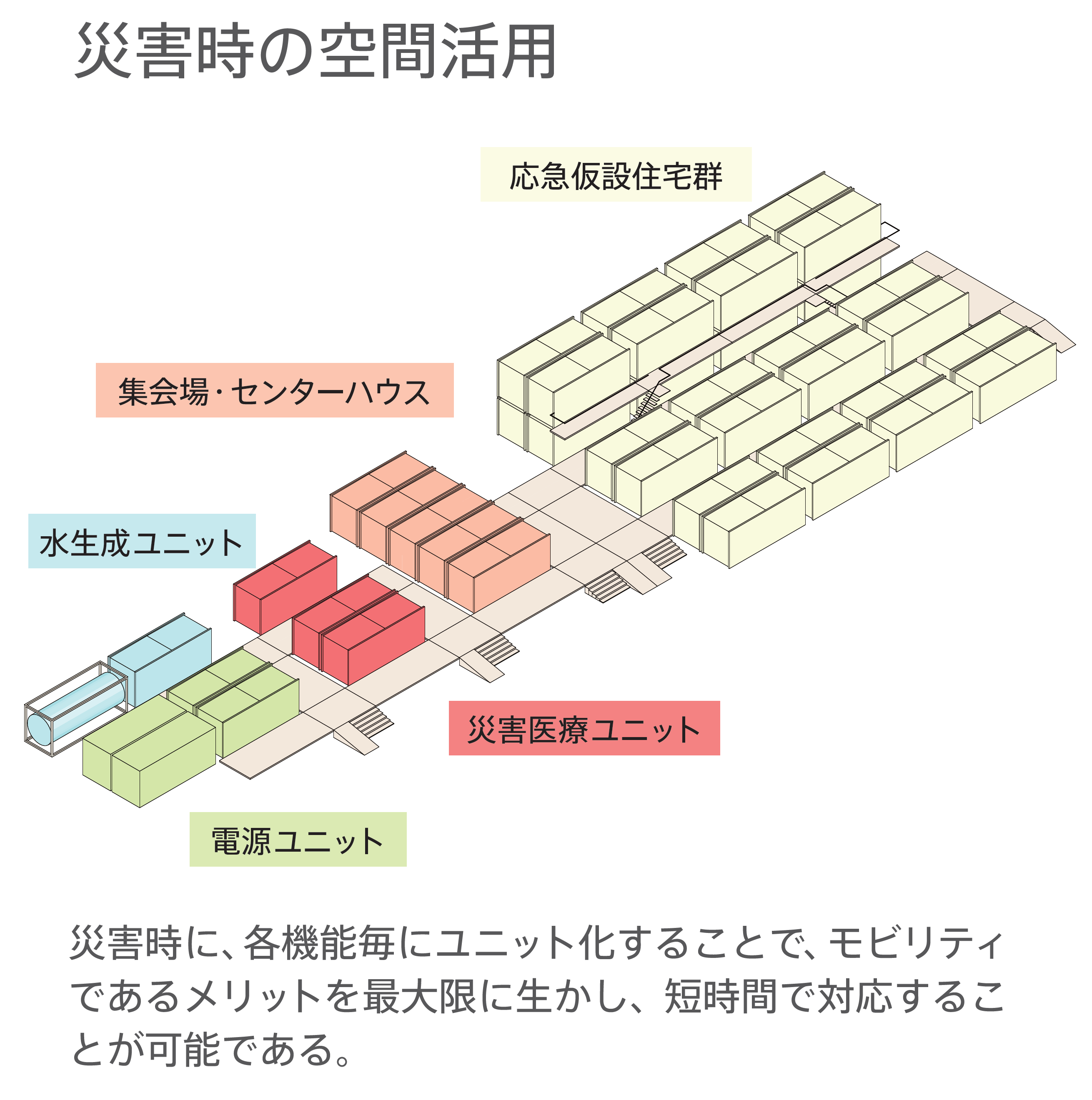 平常時はグランピングやワークショップなどのレクリエーション空間として、災害などの非常時には速やかに被災地へ移動し、複数を組み合わせて臨時の避難所や仮設住宅として住空間を提供。今後、国内での量産に向けた検討を進めるとともに、ユニットモビリティ内において発電や生活用水の生成といったインフラを整備するなど、災害などに対するレジリエンスの向上を目指します。