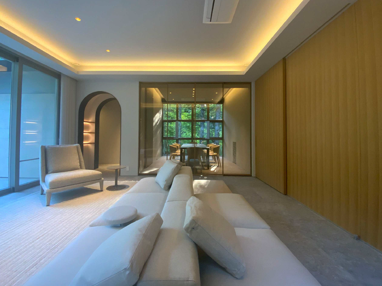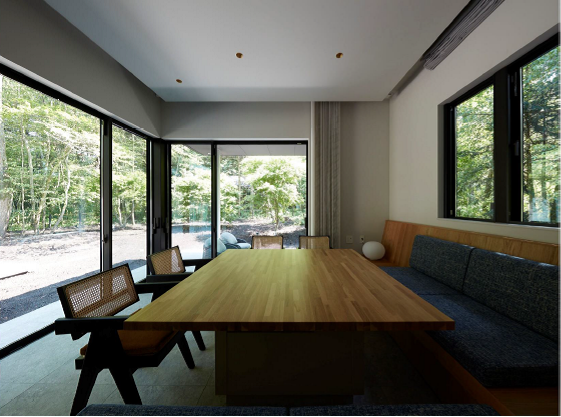 コロナ禍は、私たちの生活を激変させた。リモートワークは当たり前になり、密を避け、人との距離にも敏感になった。こうした経験を経て私たちは、どこにどう住まうのかという解像度の高い選択を迫られることになった。この住宅は、こうした状況をむしろ前向きに捉え、自然の中で家族相互が適切な距離を保ちながら暮らすことがで きる快適な空間を、これからの住まいの一つのかたちとして提示している。平家の穏やかな佇まいは、周囲の自然環境とも絶妙な呼応関係を築き、こうした困難な時代であっても、未来に向けての新しい可能性を感じさせてくれる。