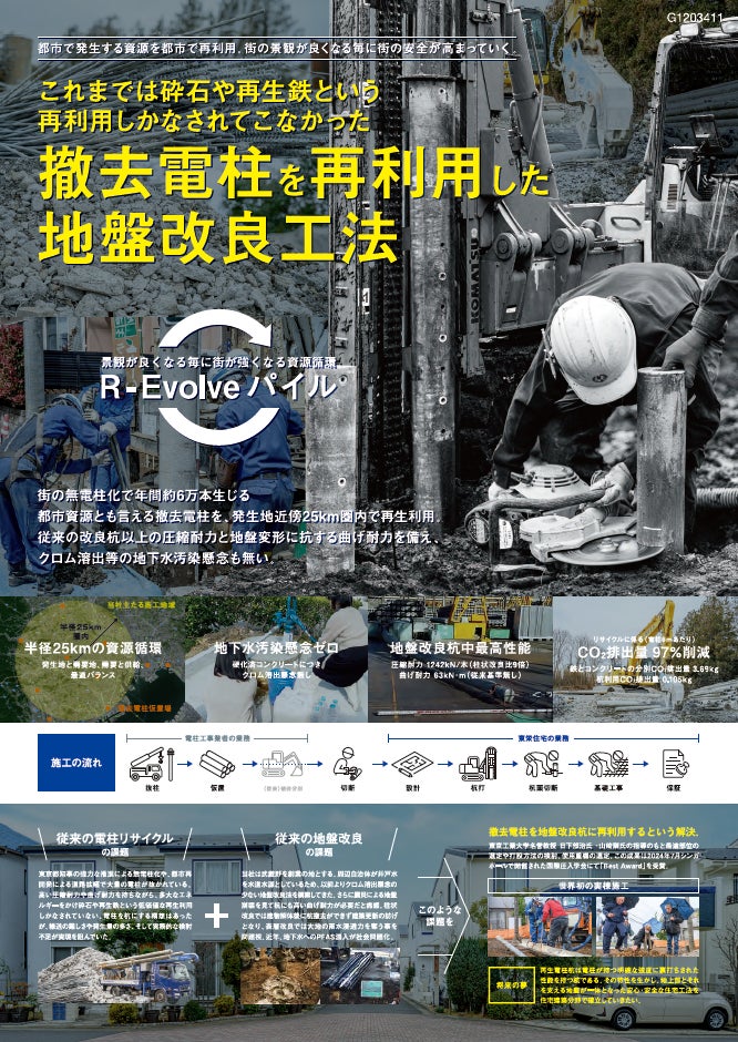 都市で発生する撤去電柱を再利用し、街の景観改善と都市資源の循環利用を進める新しい地盤改良工法が「R-Evolve パイル」です。従来の砕石や再生鉄への再利用に代わり、撤去電柱を地盤改良杭として使用し、圧縮耐力(柱状改良比9倍)や曲げ耐力に優れる性能を発揮します。特に、クロム溶出などの地下水汚染の懸念もなく、再利用範囲を発生地近傍25km圏内に限定することで、資源の循環利用を促進させます。