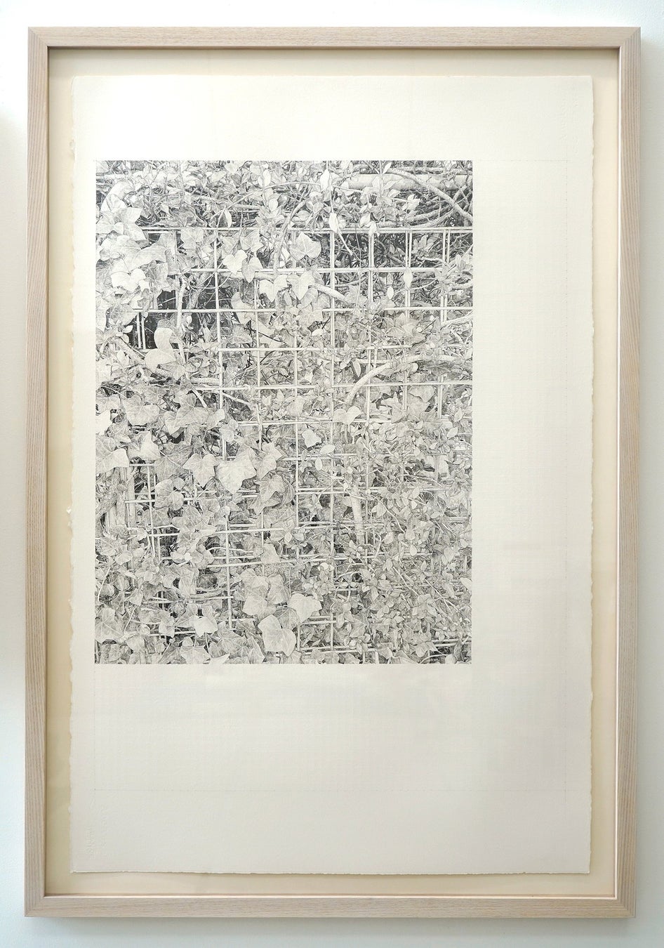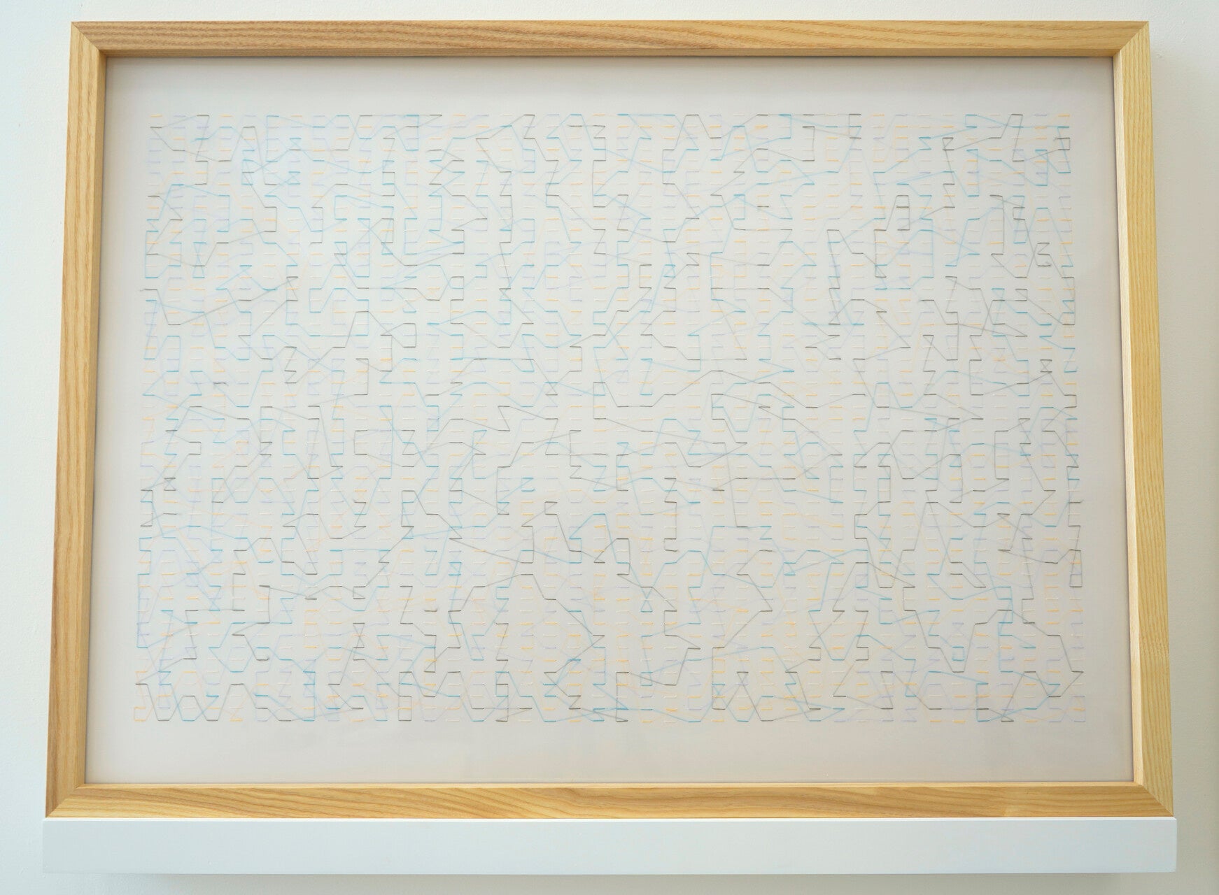 本展「忘れ水」では、未発表の新作シリーズ《描かないためのエスキース》から1点展示をするほか、井上の代表作である直線を反復して描くことによって方眼紙のようなイメージを描き出すシリーズ「スフ」と刺繍の線が紙の表面・裏面を行き来する「表と裏のためのドローイング」を展示いたします。