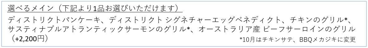 イクラやスモークサーモンがたっぷりのったエッグベネディクト、旬のフルーツを使ったディストリクト パンケーキ、チキンやビーフサーロインのグリルなど気分に合わせてメインをお選びいただけます。ボリュームたっぷりで大満足の人気メニューを満喫して。