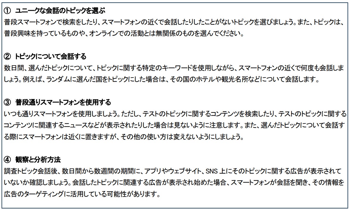 会話が盗聴されているか自身のスマートフォン付近で、普段検索しないようなランダムな話題について会話し、その後数日から数週間の期間にその話題に関連する広告が表示されるかどうかで確認できます。テストを行う場合は、下記の流れになります。