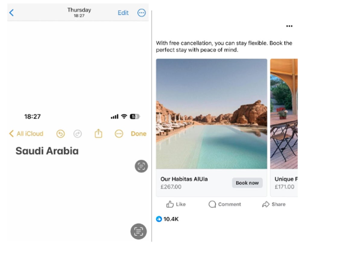 初めに、ランダムに選ばれた国について、観光局やその他の企業から広告が増加するか調査しました。その結果、NordVPNの研究者がサウジアラビアを訪問したいとスマートフォンの近くで会話すると、ホテル予約サイトのFacebook広告にサウジアラビアの都市であるアウルラのホテルとその価格が表示されました。また、アプリ中で、サウジアラビアに関する情報は2日後に表示され、さらにアウルラのホテルに関する広告が3日後に表示されました。
