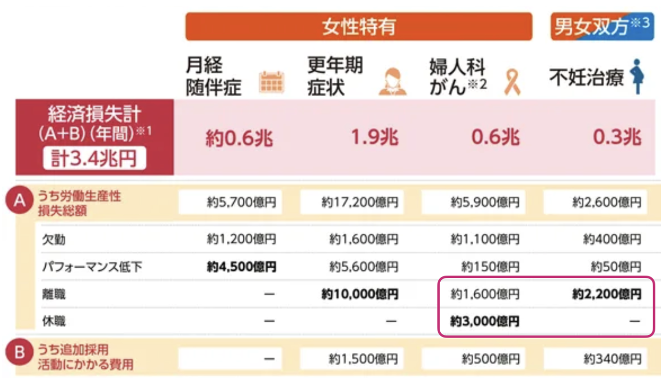 また、経済産業省が2024年2月に発表した「女性特有の健康課題による経済損失の試算と健康経営の必要性について」によると、女性特有の健康課題による社会全体の経済損失は年間3.4兆円(図1)に上ると試算され、女性の健康問題が企業経営に及ぼす影響は決して小さくありません。特に、不妊治療や婦人科がんによる離職・休職は、企業にとって重大な経済損失をもたらしています。