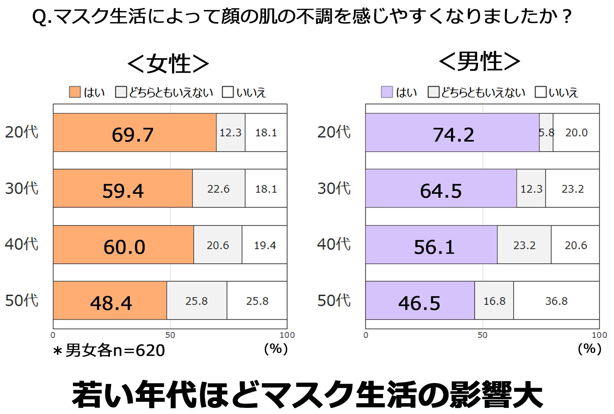 ・マスク生活で肌の不調を感じることが増加。男女ともに若い年代ほど影響大
