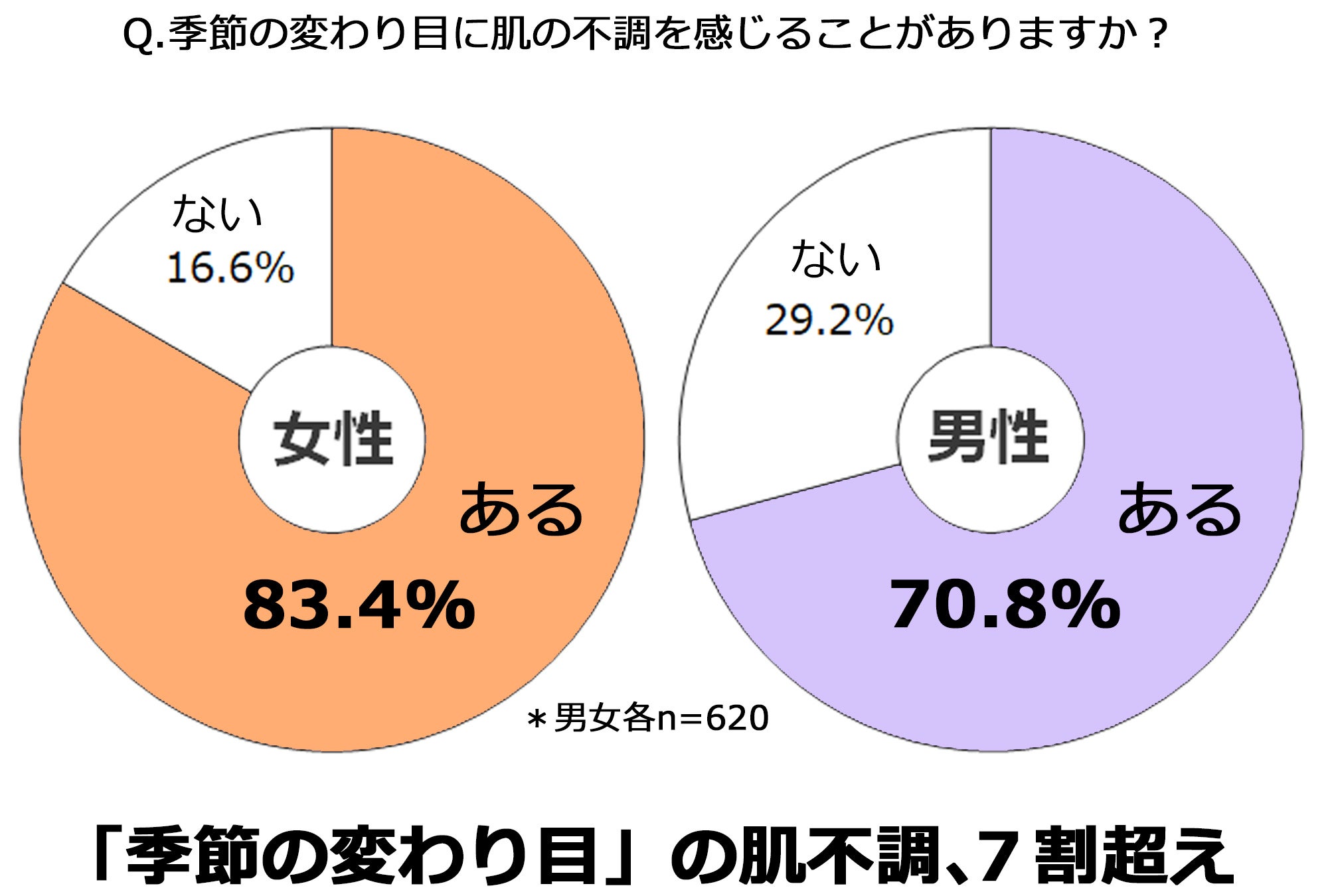 続いて、一時的に肌の不調を感じることがあると回答した男女各620人に、季節の変わり目に不調を感じるか尋ねました。すると女性は、83.4%、男性は70.8%と、男女ともに、季節の変わり目に不調を実感している人が多いことがわかりました。