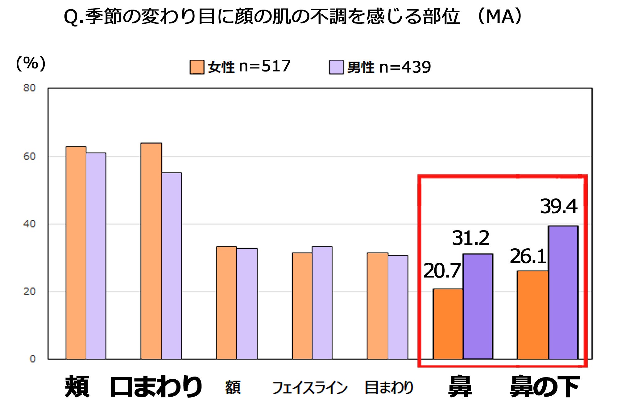 ・季節の変わり目の不調部位は「頬」「口まわり」。「鼻」と「鼻の下」は男女差顕著